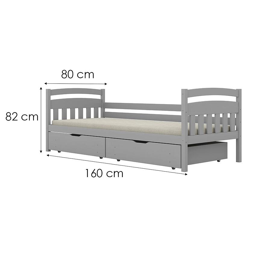 W zestawie znajduje się stelaż dopasowany do materaca o wymiarach 160x80 cm, co zapewnia odpowiednie podparcie ciała podczas snu. Materac nie jest dołączony, dzięki czemu możesz wybrać model idealnie dopasowany do indywidualnych potrzeb Twojego dziecka. Wysokość łóżka 82 cm ułatwia wchodzenie i wychodzenie, a przestrzeń pod pojemnikami zwiększa dostęp do dodatkowego przechowywania.