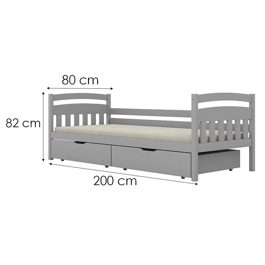 W zestawie znajduje się stelaż dopasowany do materaca o wymiarach 200x80 cm, co zapewnia odpowiednie podparcie ciała podczas snu. Materac nie jest dołączony, dzięki czemu możesz wybrać model idealnie dopasowany do indywidualnych potrzeb Twojego dziecka. Wysokość łóżka 82 cm ułatwia wchodzenie i wychodzenie, a przestrzeń pod pojemnikami zwiększa dostęp do dodatkowego przechowywania.