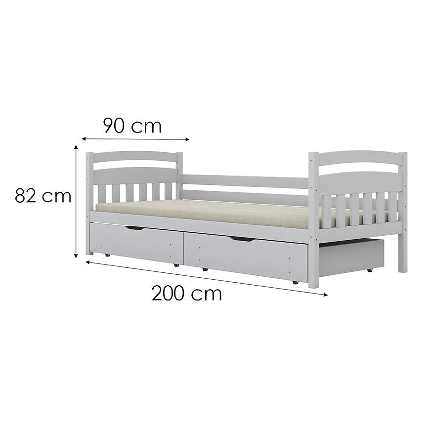 W zestawie znajduje się stelaż dopasowany do materaca o wymiarach 200x90 cm, co zapewnia odpowiednie podparcie ciała podczas snu. Materac nie jest dołączony, dzięki czemu możesz wybrać model idealnie dopasowany do potrzeb Twojego dziecka. Wysokość łóżka 82 cm ułatwia wchodzenie i wychodzenie, a przestrzeń pod pojemnikami zwiększa dostęp do dodatkowego przechowywania.