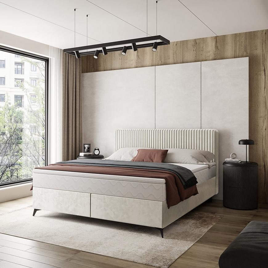 Nowoczesne łóżko Wave z topperem 140x200 Manila 01/Tilia 03 łączy elegancję z komfortem użytkowania. W zestawie otrzymujesz stelaż, materac pocket oraz topper, które zapewniają wygodny i zdrowy sen. Praktyczne dwa pojemniki na pościel oraz automatyczny podnośnik gazowy zwiększają funkcjonalność mebla. Kremowa tapicerka z tkaniny w połączeniu z czarnymi nogami nadaje wnętrzu przytulnego, nowoczesnego charakteru. Dzięki funkcji spania łóżko łączy styl, wygodę i praktyczne rozwiązania w codziennej sypialni.