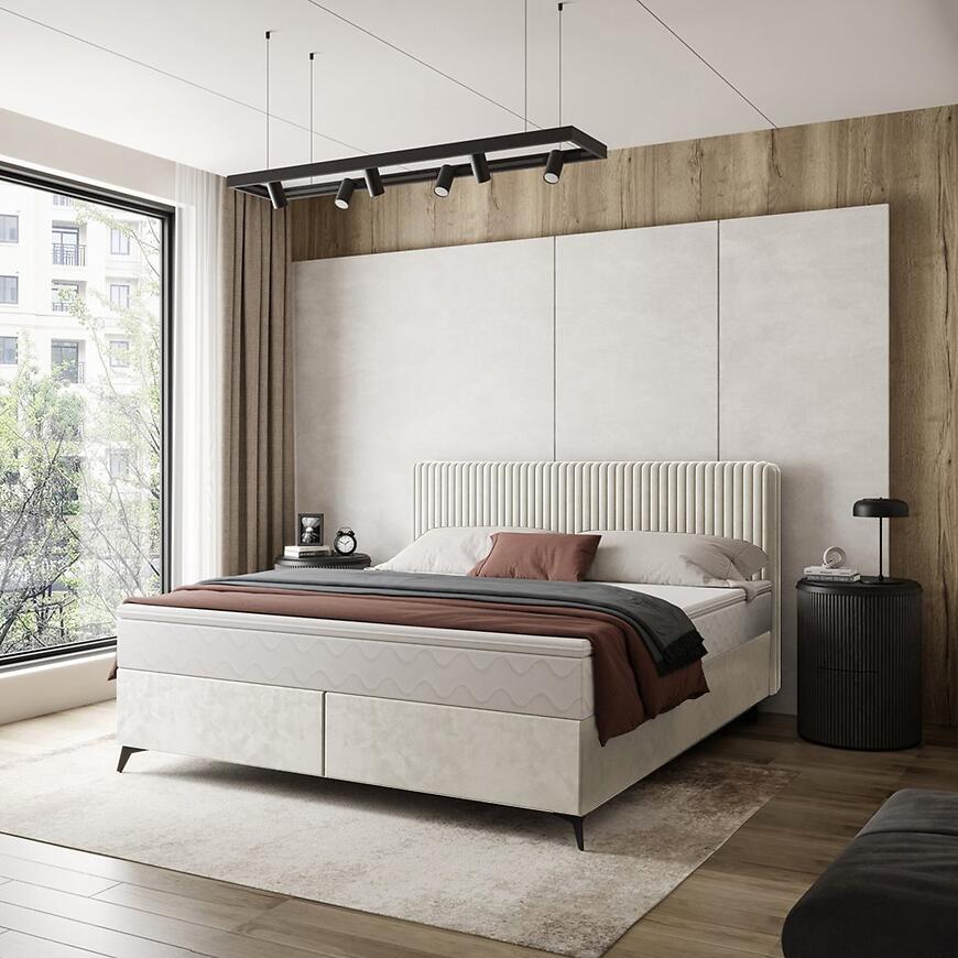 Nowoczesne łóżko Wave z topperem 180x200 Manila 01/Tilia 03 łączy elegancję z komfortem snu. W komplecie znajdują się stelaż, materac pocket oraz topper, które zapewniają wygodny i zdrowy wypoczynek. Funkcjonalne dwa pojemniki na pościel oraz automatyczny podnośnik gazowy zwiększają wygodę codziennego użytkowania. Kremowa tapicerka z tkaniny w zestawieniu z czarnymi nogami nadaje wnętrzu przytulny i nowoczesny charakter. Dzięki funkcji spania łóżko łączy styl, wygodę i praktyczne rozwiązania w jednym meblu.