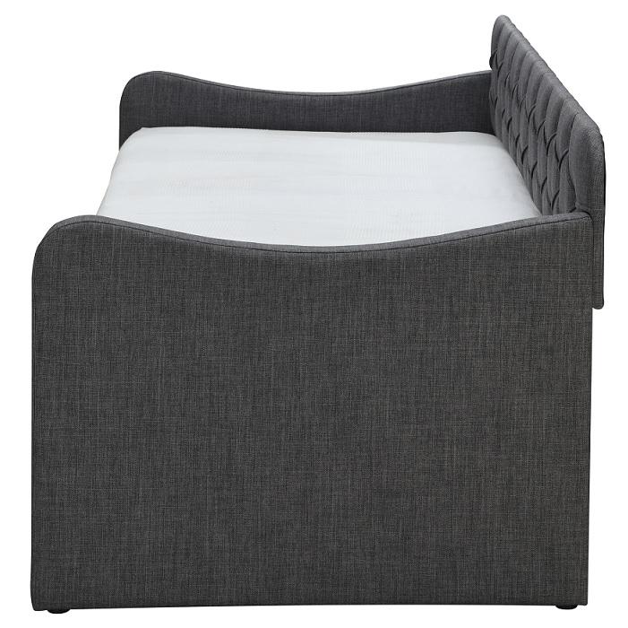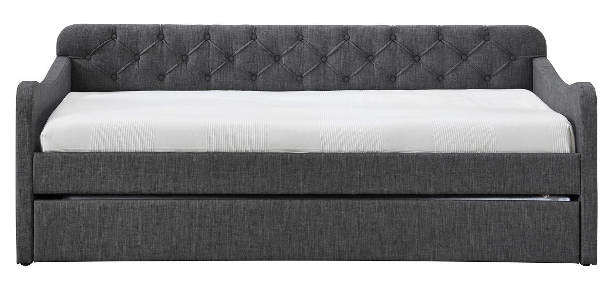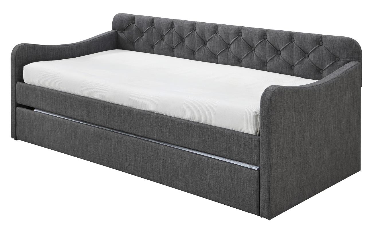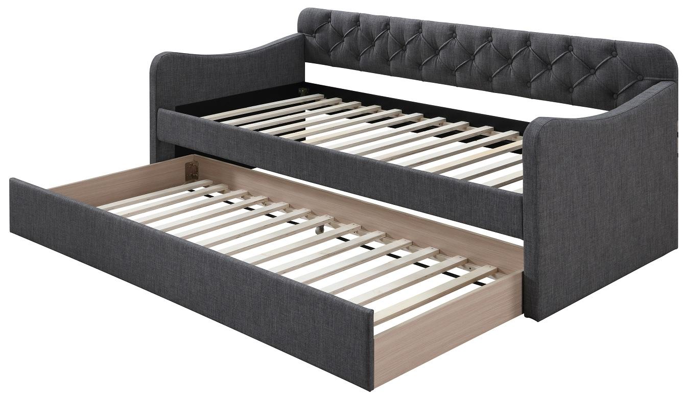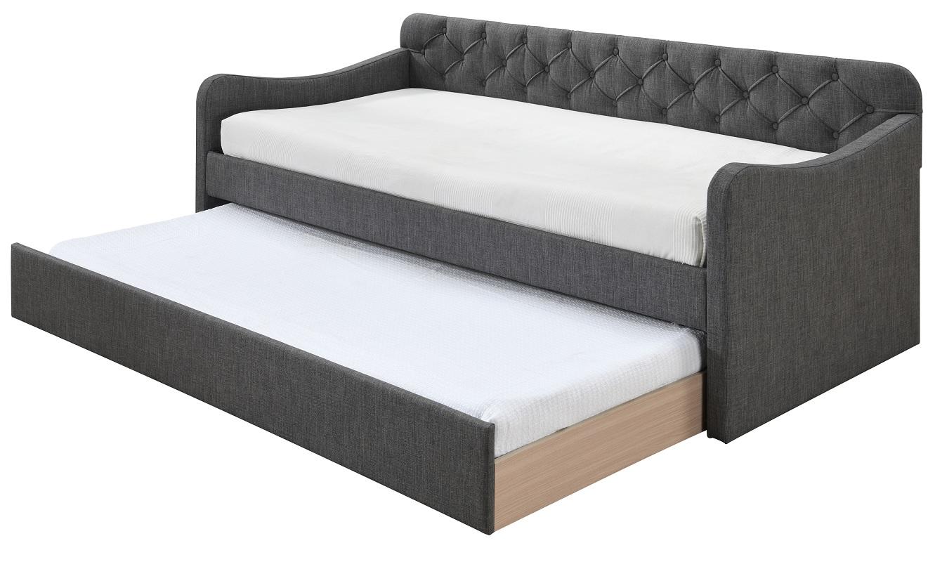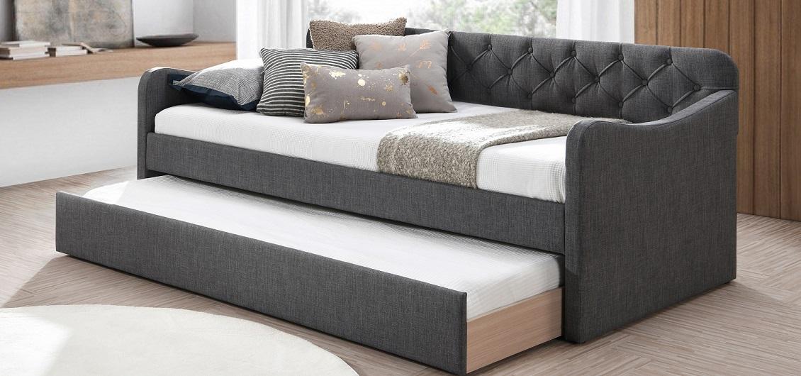 Dwuosobowe łóżko Xelo idealne sprawdzi się w pokoju młodzieżowym a także w pokoju gościnnym. Łóżko posiada drugie wysuwane miejsce do spania o wymiarach 90x200 cm. Łóżko Xelo wyposażone jest w stelaż drewniany składający się z 14 szczebli stelaża, odległość pomiędzy listewkami wynosi 9 cm. Maksymalne dopuszczalne obciążenie wynosi dla górnego łóżka 200 kg, dla dolnego łóżka 100 kg. (wraz z materacem). Łóżko Xelo tapicerowane jest tkaniną w kolorze szarym, dodatkowo posiada ozdobne wciągi na oparciu.