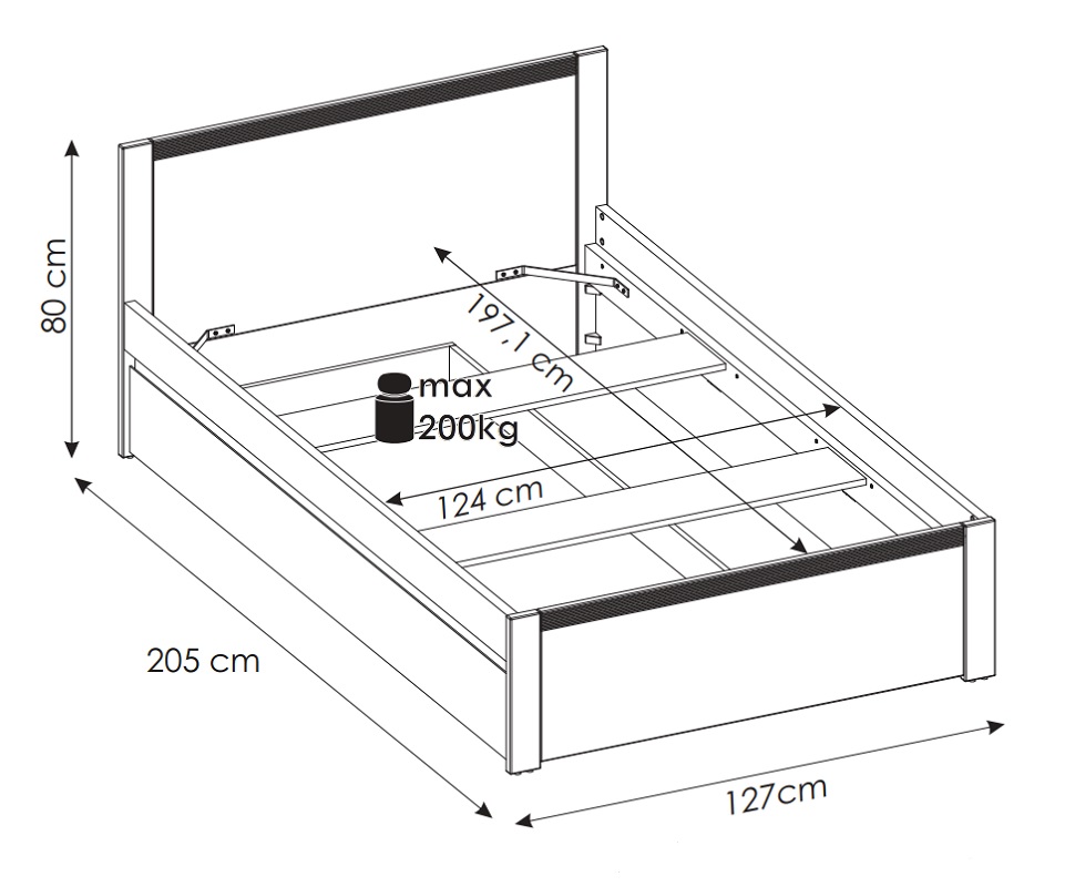 Konstrukcja łóżka oparta jest na szczytach z płyty wiórowej laminowanej i MDF oraz bokach z płyty wiórowej laminowanej, co zapewnia trwałość i odporność na codzienne użytkowanie. Materiały są łatwe do utrzymania w czystości, a solidne wykonanie gwarantuje stabilność i bezpieczeństwo. Łóżko sprzedawane jest bez stelaża i materaca, co pozwala wybrać model dopasowany do indywidualnych potrzeb.