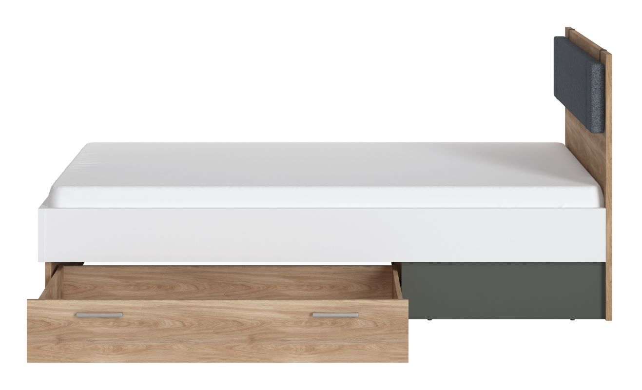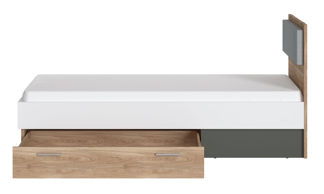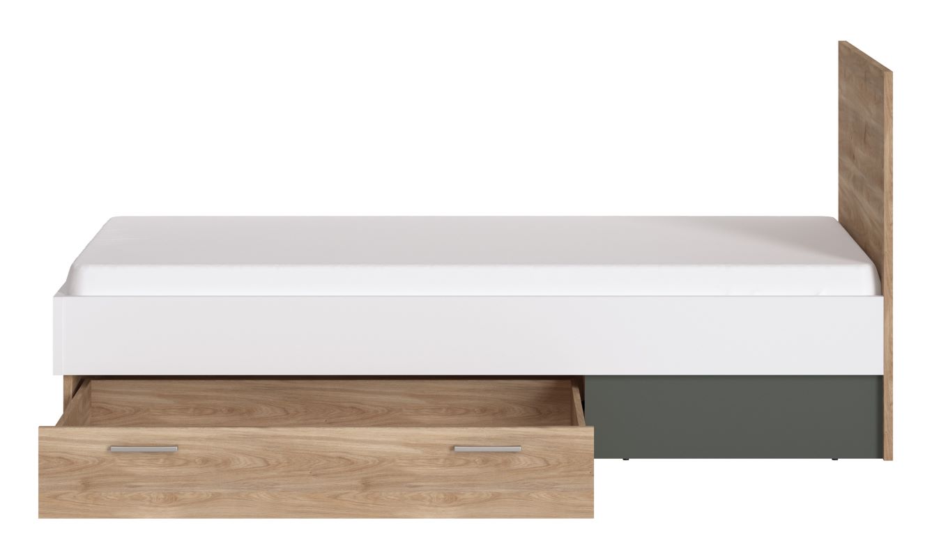 Łóżko Twenty wyposażone jest w jedną pojemną szufladę, idealną do przechowywania pościeli, ubrań lub innych akcesoriów. To praktyczne rozwiązanie, które pozwala utrzymać porządek w pokoju, jednocześnie nie zajmując dodatkowego miejsca. Mebel nie posiada pojemnika na pościel, dzięki czemu konstrukcja pozostaje lekka i nowoczesna w formie.