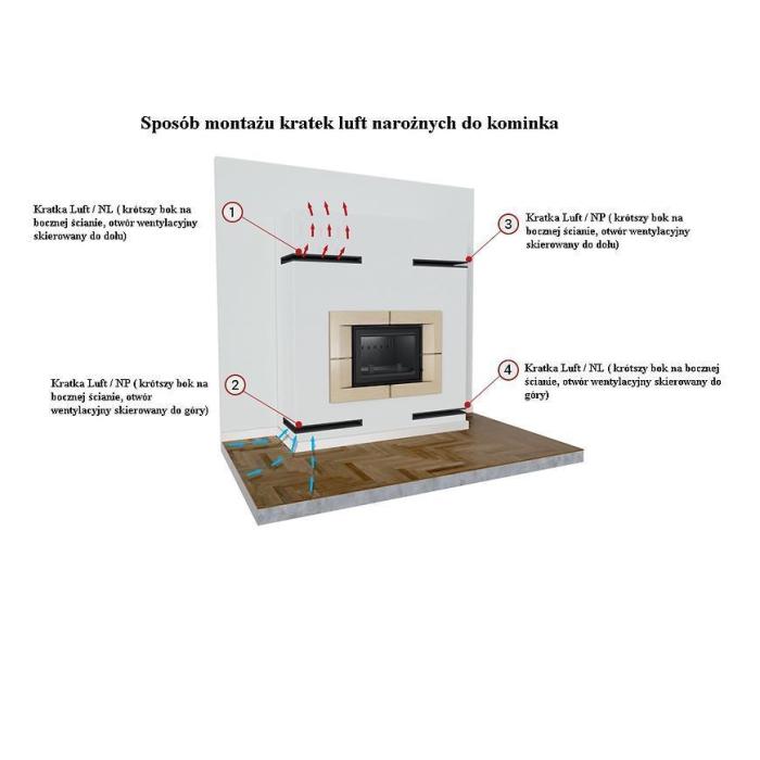 Lufty montujemy u góry obudowy kominka – kiedy ma być ona wylotem powietrza ciepłego, lub u dołu obudowy kominka jako wlot powietrza chłodnego do kominka. Kratki montujemy za pomocą sprężyn dociskowych.