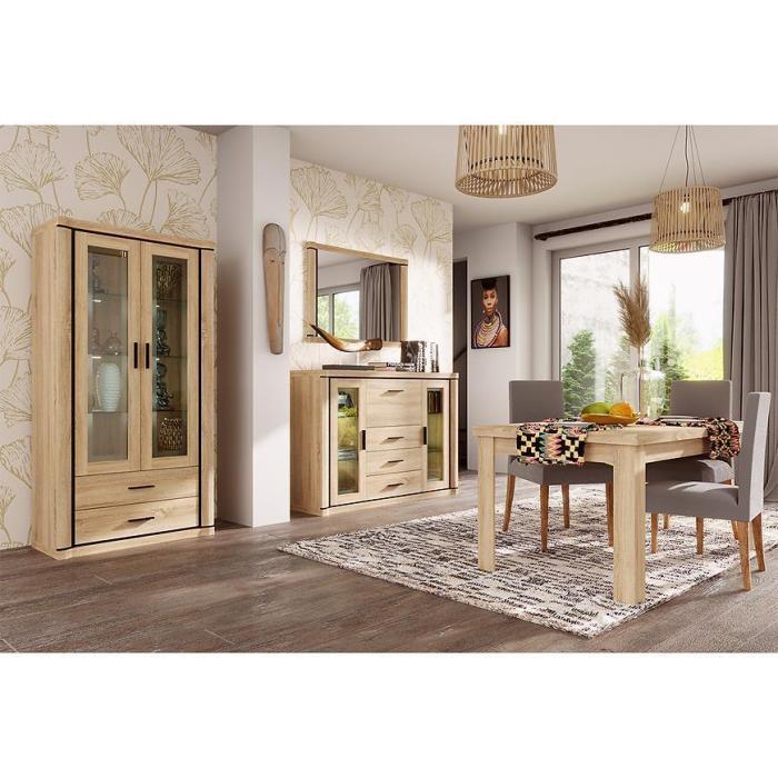 Mebel Dallas wyróżnia się zastosowaniem wysokiej jakości płyty wiórowej laminowanej, co gwarantuje trwałość i wytrzymałość. Dekor w odcieniu dębu sonoma stanowi naturalne tło, w którym wyraża się prostota i elegancja. Matowe wykończenie frontów i korpusów podkreśla minimalistyczną estetykę, tworząc jednocześnie spójny i stonowany wygląd.