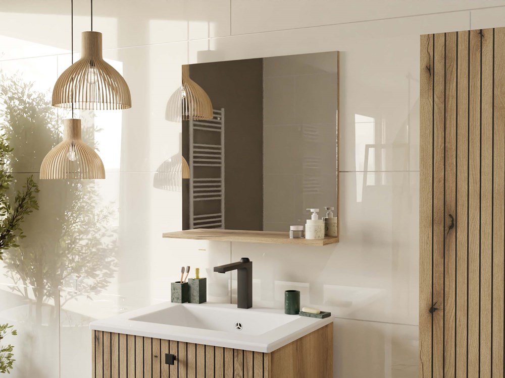 Lustro łazienkowe z półką Trigo w wybarwieniu dąb evoke to praktyczny i stylowy element wyposażenia, który łączy funkcjonalność z nowoczesnym designem. Dzięki kompaktowym wymiarom – 60 cm szerokości i 61,5 cm wysokości – doskonale sprawdzi się w mniejszych przestrzeniach, takich jak łazienka, przedpokój czy garderoba. Naturalne wykończenie w odcieniu dębu evoke wprowadza do wnętrza ciepło i elegancję, a minimalistyczna forma pasuje zarówno do nowoczesnych, jak i klasycznych aranżacji.