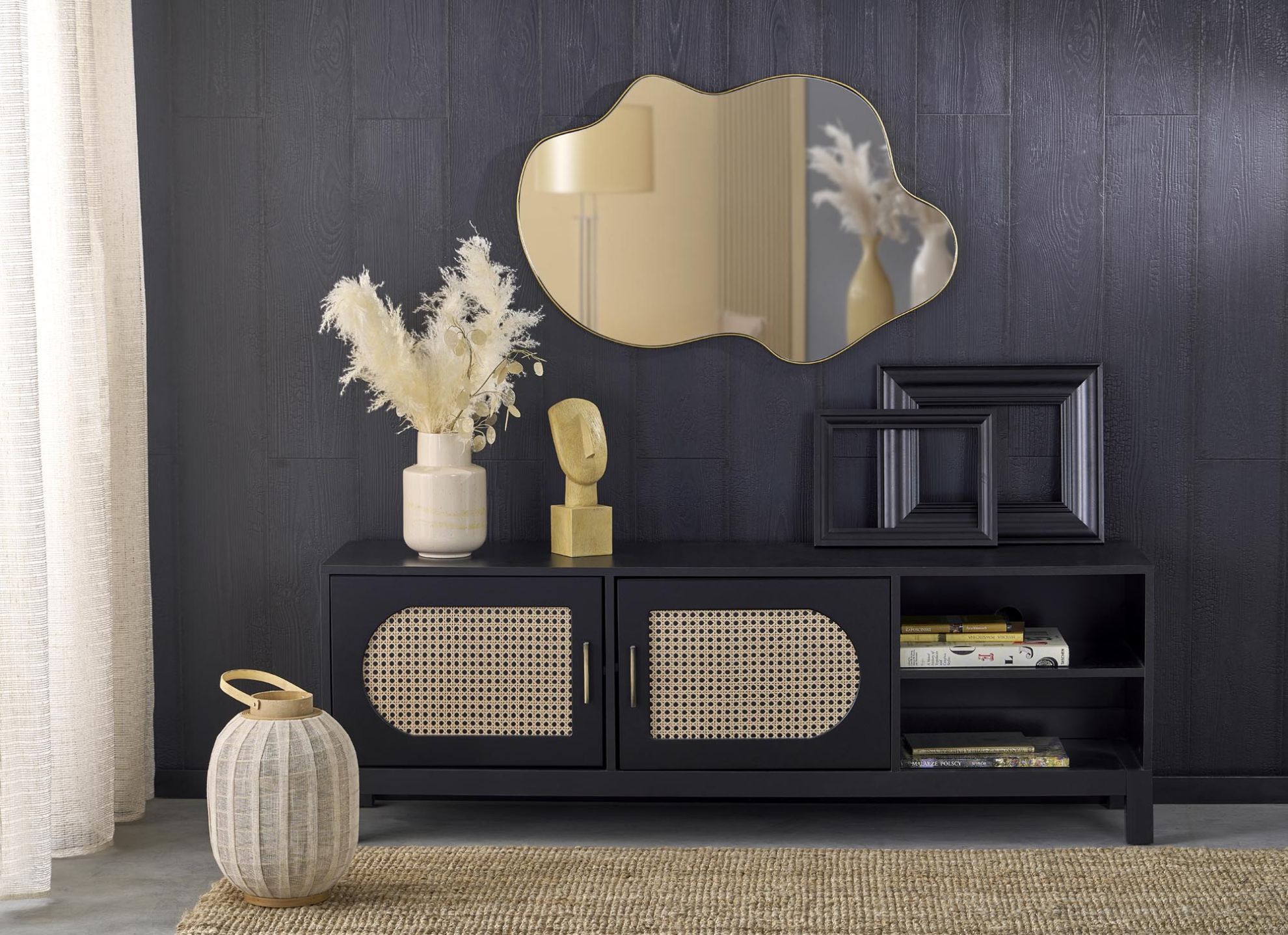 Lustro ścienne Essien złote nie tylko odbija światło, powiększając optycznie przestrzeń, ale również pełni funkcję dekoracyjną. Idealne nad komodą w salonie, w przedpokoju nad konsolą czy w sypialni nad toaletką. Solidna konstrukcja i elegancka kolorystyka sprawiają, że lustro jest trwałym elementem wyposażenia, który łatwo dopasować do wnętrza.
