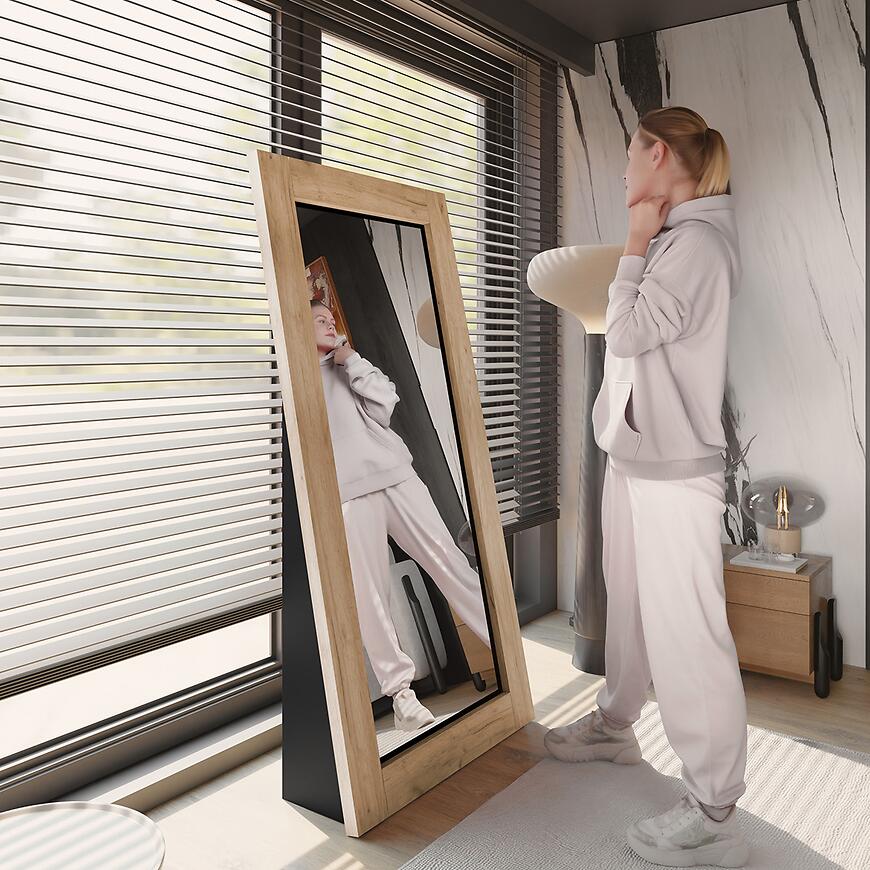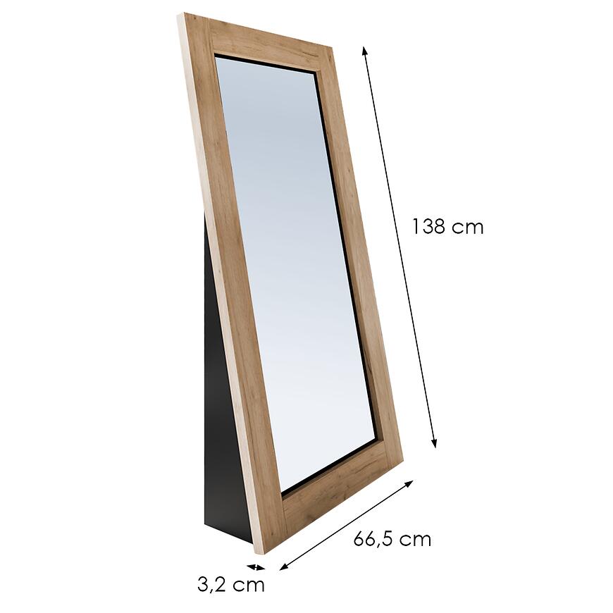 Lustro Vemo Stojące Pionowe w kolorze Dąb Craft Złoty to eleganckie, nowoczesne lustro o prostokątnym kształcie. Jego wymiary wynoszą 66,5 cm szerokości, 138 cm wysokości, a głębokość ramy to 3,2 cm. Wykonane z laminowanej płyty wiórowej, waży 21,5 kg, nie posiada oświetlenia i przeznaczone jest do ustawienia w pozycji stojącej.