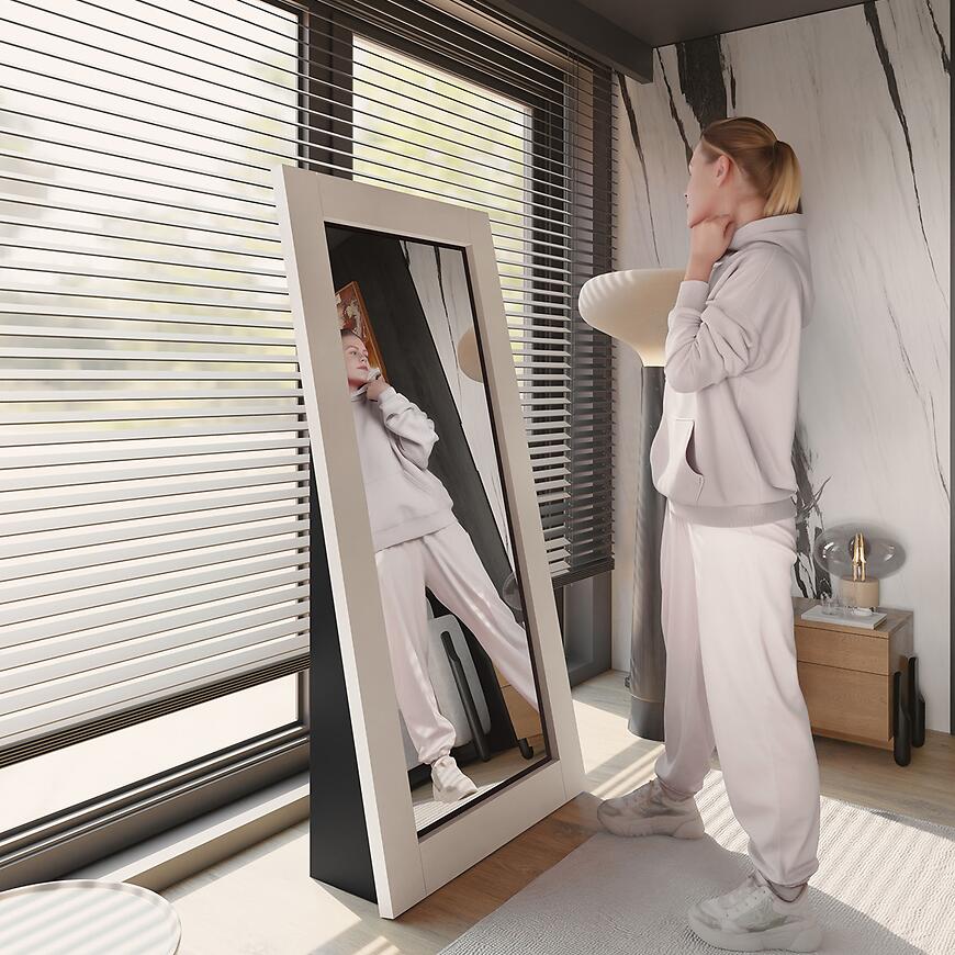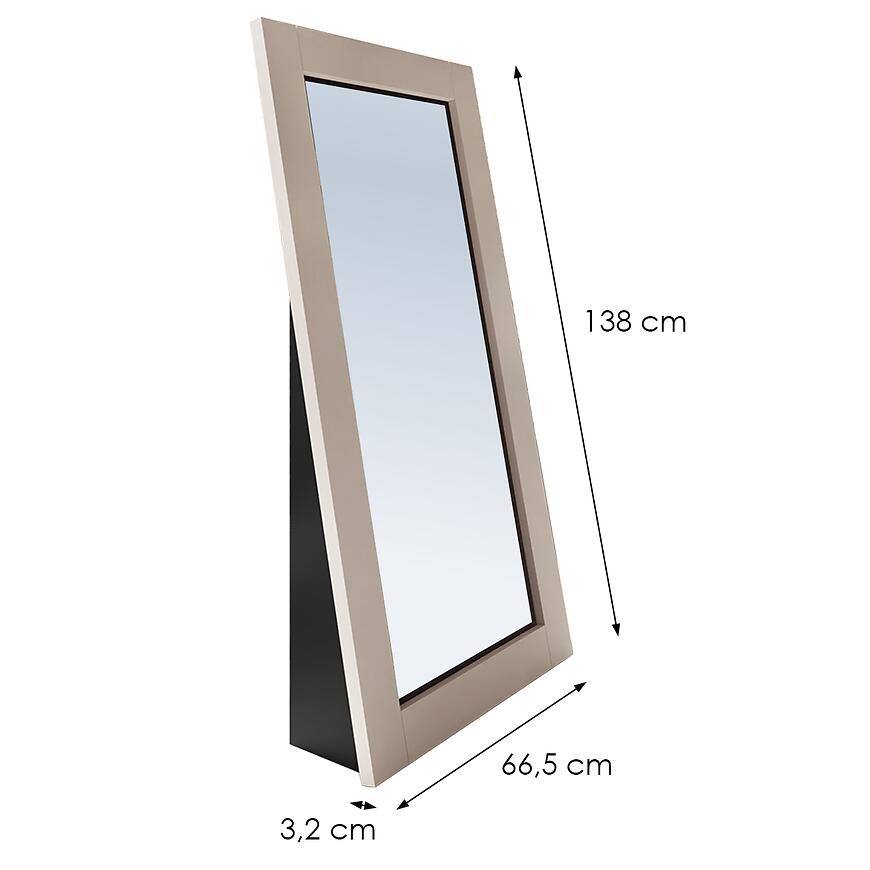 Lustro Vemo Stojące Pionowe w kolorze Kaszmir to nowoczesne lustro o prostokątnym kształcie, idealne do wnętrz w stonowanej kolorystyce. Jego wymiary to 66,5 cm szerokości i 138 cm wysokości, a głębokość ramy wynosi 3,2 cm. Wykonane z laminowanej płyty wiórowej, waży 21,5 kg, nie posiada oświetlenia i przeznaczone jest do ustawienia w pozycji stojącej.