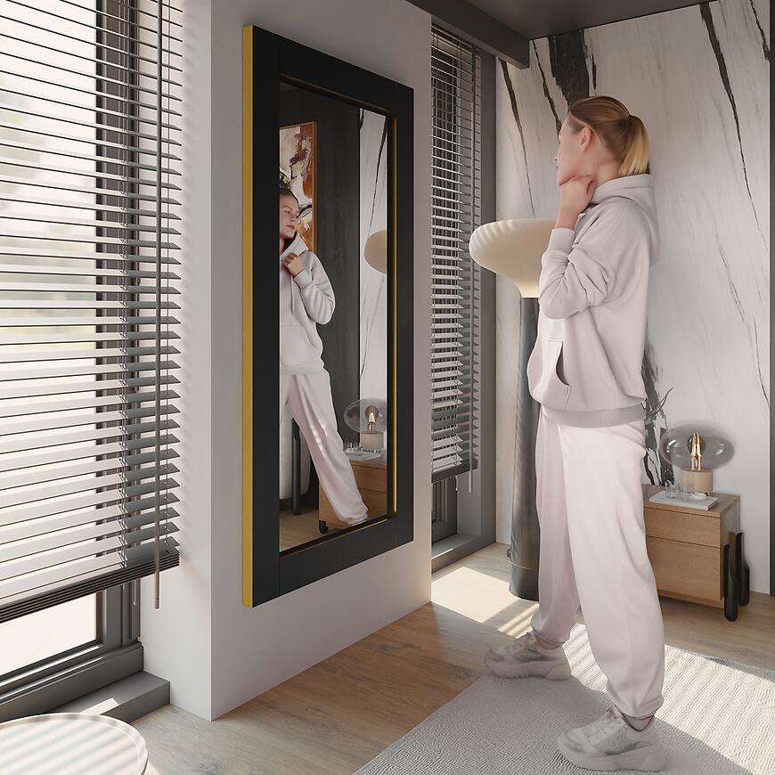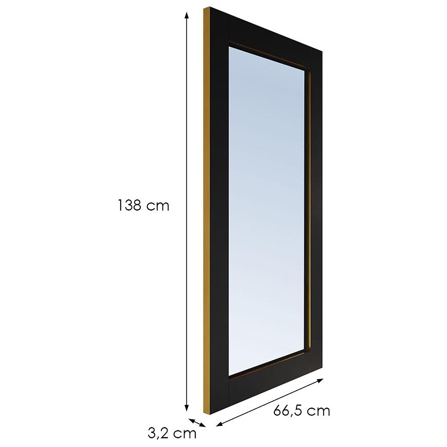 Lustro Vemo Wiszące Pionowe w kolorze Czarny z Złotą Okleiną to nowoczesne lustro o prostokątnym kształcie. Ma wymiary 138 cm szerokości i 66,5 cm wysokości, a głębokość ramy wynosi 3,2 cm. Wykonane jest z laminowanej płyty wiórowej, waży 18,5 kg, nie posiada oświetlenia i przeznaczone jest do zawieszenia na ścianie.