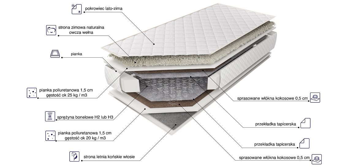 Materac wyposażono w pokrowiec lato/zima, wykonany z mieszanki: 38% poliester, 25% bawełna i 37% polipropylen.
