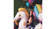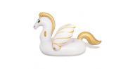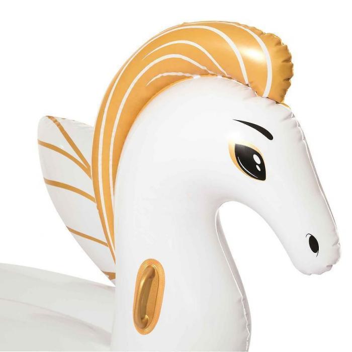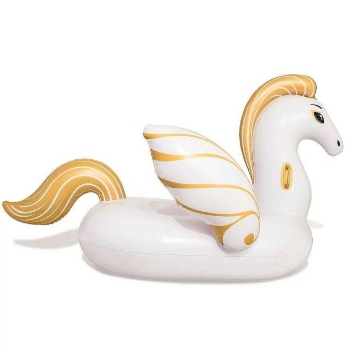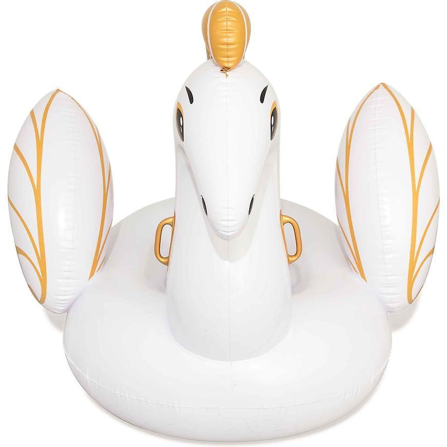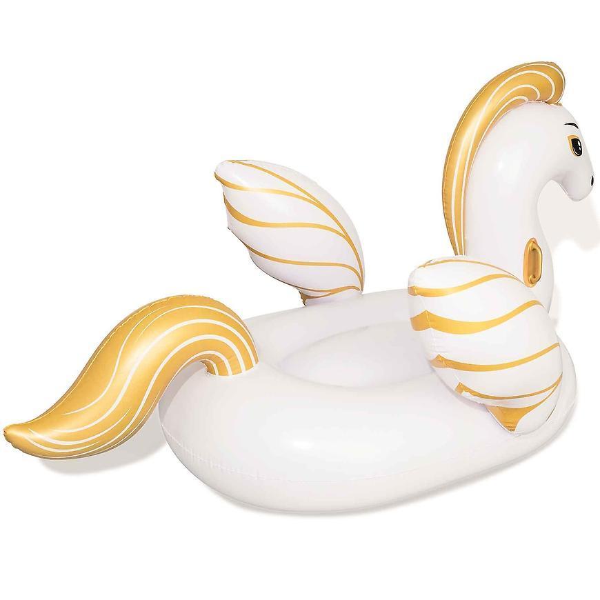 Dmuchany pegaz do pływania w kolorze białym z złotymi akcentami i wymiarach 2,31x1,5m. Posiada 3 komory nadmuchiwania oraz 2 uchwyty do trzymania. Wykonany z materiału vinyl 0.32mm.