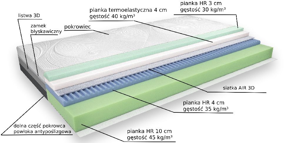 Materac nadaje się do stelaży regulowanych i wymaga użycia stelaża z giętymi listwami, przy zachowaniu odstępów nie większych niż 3 cm, aby zapewnić optymalne podparcie i wydłużyć żywotność produktu. Zdejmowalny pokrowiec z taśmą 3D ułatwia utrzymanie czystości. Materiały użyte w materacu posiadają certyfikat OEKO-TEX, co gwarantuje bezpieczeństwo i wysoką jakość wykonania.