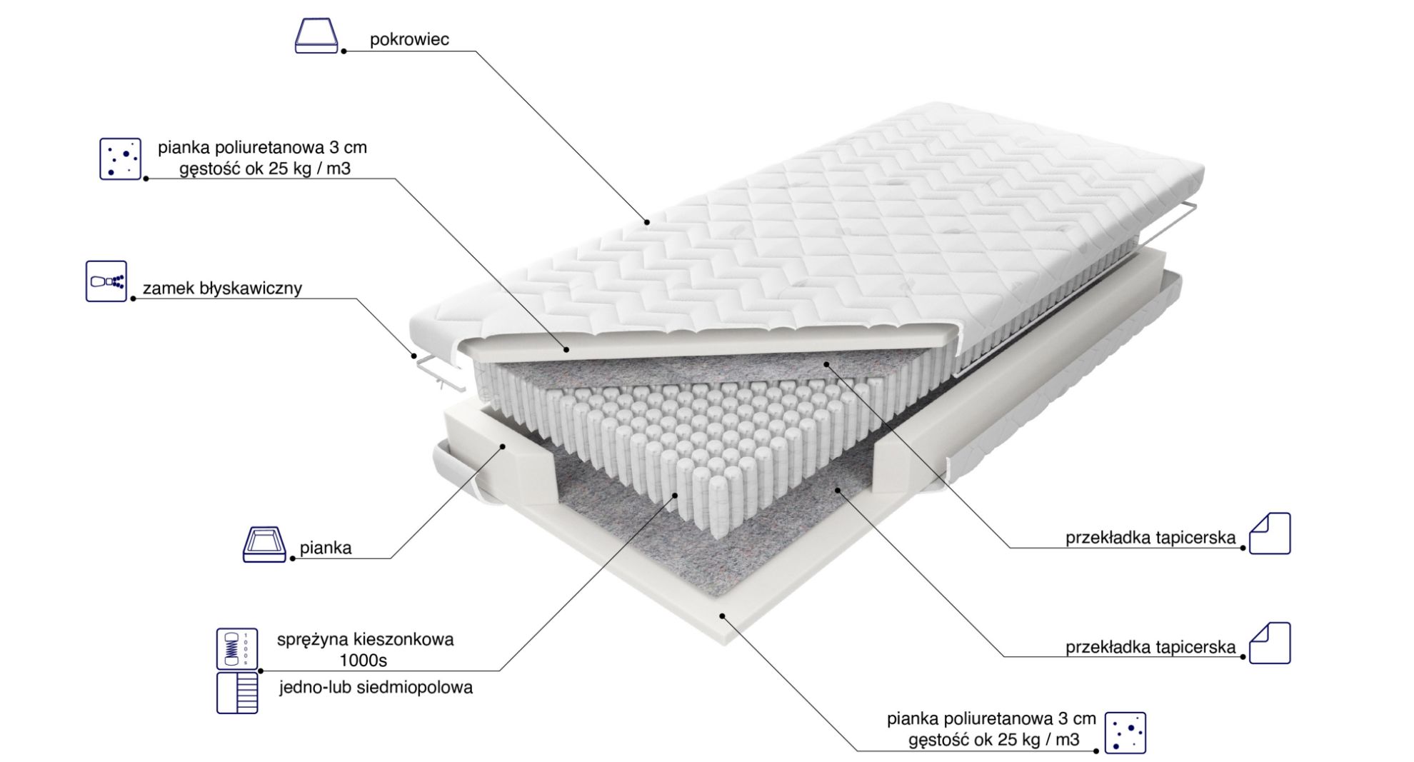 - Konstrukcja sprężyn Multipocket 1000S: Wykonane z wysokogatunkowego drutu sprężyny umieszczone w oddzielnych kieszeniach gwarantują trwałość i cichą pracę.