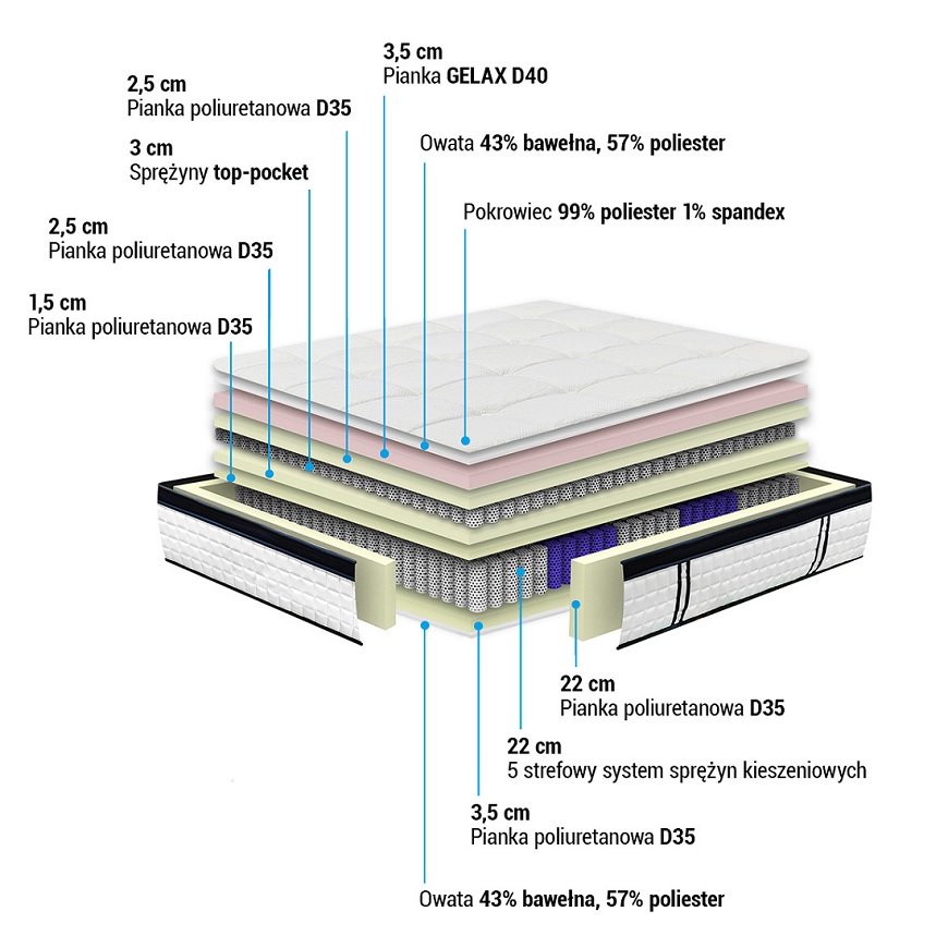 - Pianka poliuretanowa D35: Stosowana w kilku warstwach, zapewnia stabilność, dodatkowe wsparcie i redukuje uczucie zapadania się.