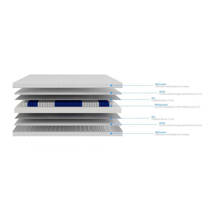 Materac zbudowany jest z systemu warstw matinee layer. Każda warstwa spełnia inną rolę w budowie materaca. Dzięki odpowiednio dobranej grubości warstw materac idealnie dopasowuje do sylwetki osoby na nim leżącej.