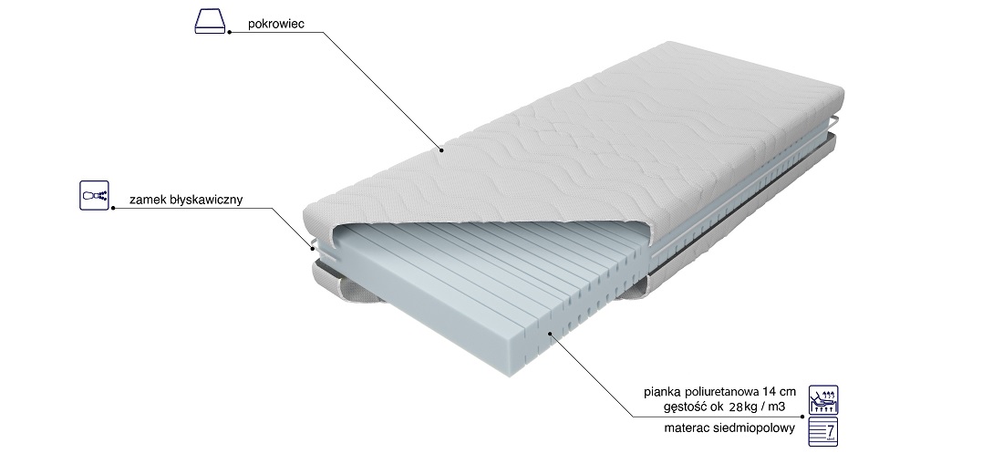 Materac wyposażono w pokrowiec Sena, który został uszyty z mieszanki 30% wiskozy i 70% poliestru. Taka kombinacja materiałów zapewnia wyjątkową miękkość i przewiewność, sprzyjając cyrkulacji powietrza i zapobiegając przegrzewaniu w trakcie snu.
