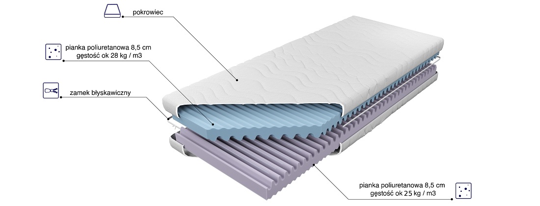 - Strona H3 (twarda): Pianka o gęstości 28 kg/m³, polecana dla osób ważących do 90 kg.
