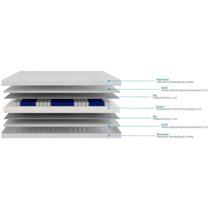 Konstrukcja materaca: 2cm PU25 | filc | pocket | filc | 2cm PU25