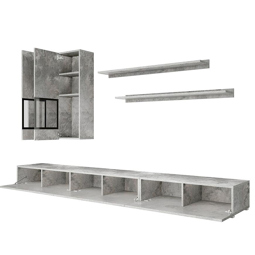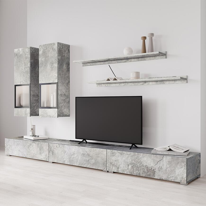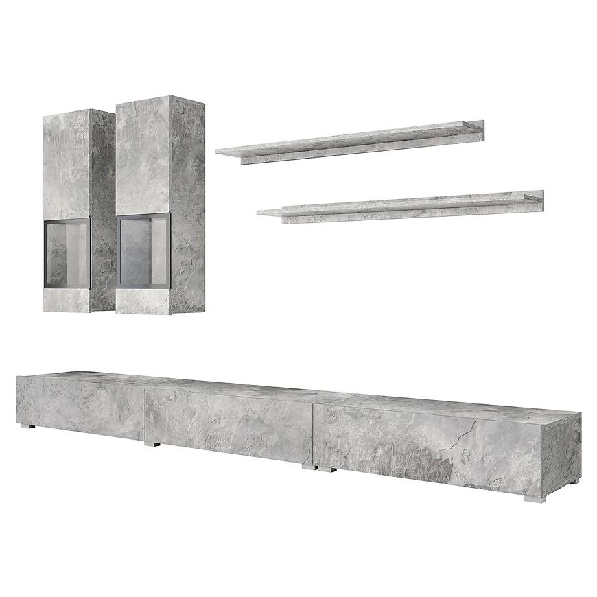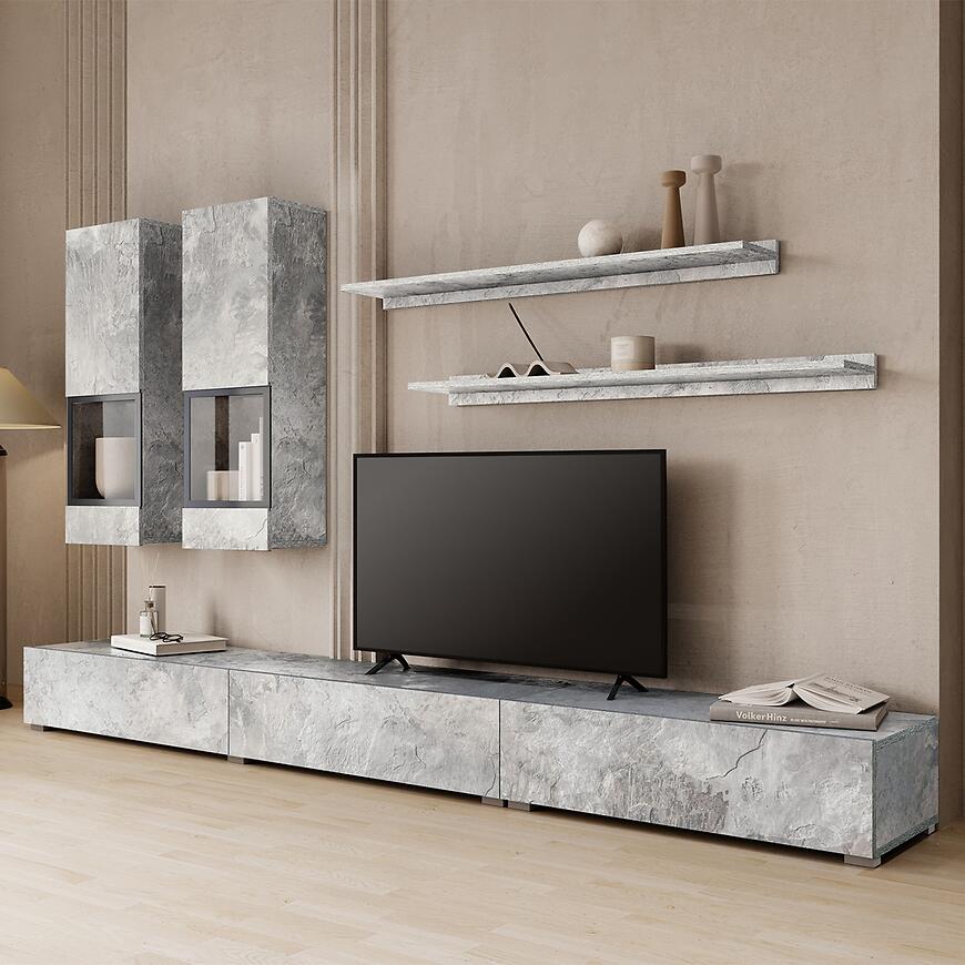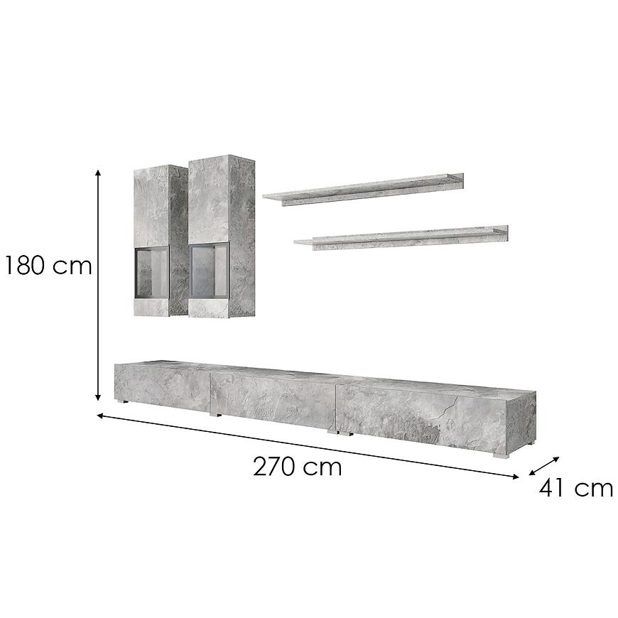 Meblościanka Baros w kolorze jasny beton to propozycja dla osób ceniących nowoczesny design połączony z funkcjonalnością. Wysoka na 180 cm, szeroka na 270 cm i głęboka na 41 cm, idealnie wpasowuje się nawet w węższe przestrzenie, oferując jednocześnie dużo miejsca do przechowywania. Matowe wykończenie frontów i korpusu nadaje wnętrzu elegancki, stonowany charakter, który pasuje do współczesnych salonów i pokojów dziennych.