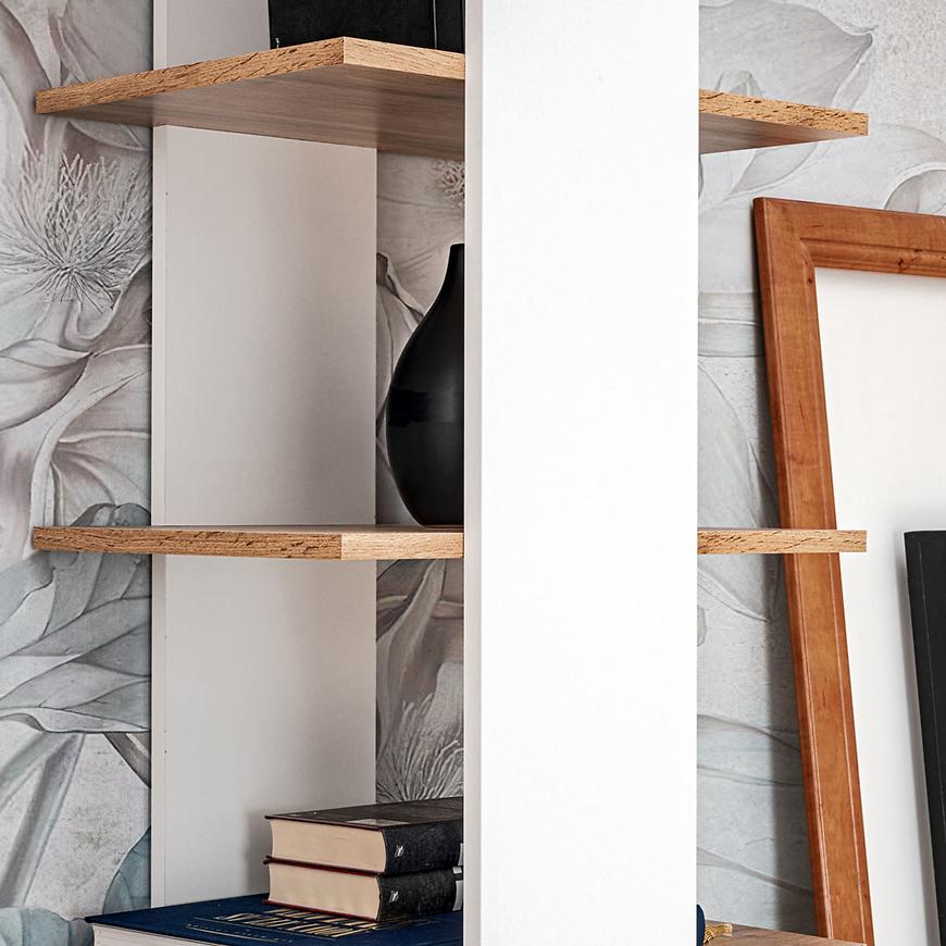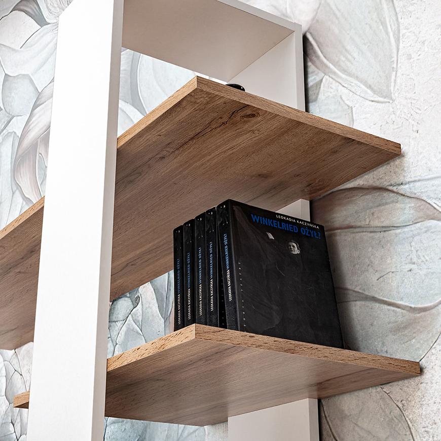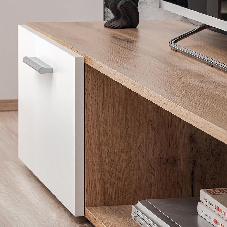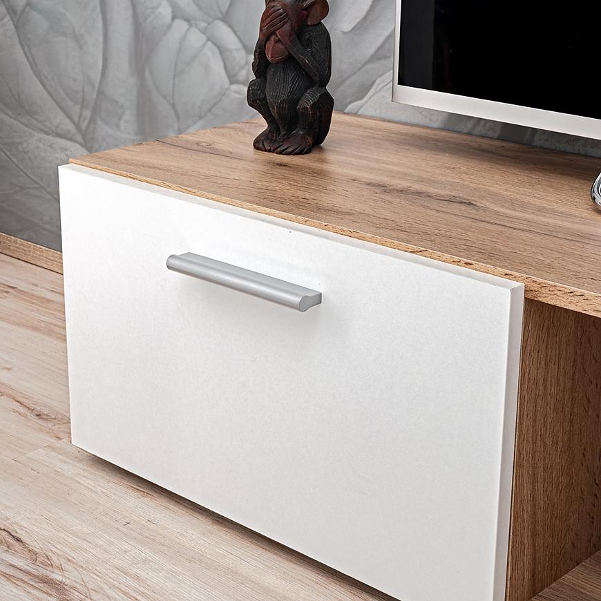 Fronty i korpus meblościanki są wykonane z wysokiej jakości płyty wiórowej laminowanej, co gwarantuje trwałość i elegancję. Matowa powłoka dodatkowo dodaje subteności, a mebel jest łatwy do utrzymania w czystości. Zastosowana kolorystyka kontrastuje ze sobą, jednocześnie tworząc uzupełniającą się całość.