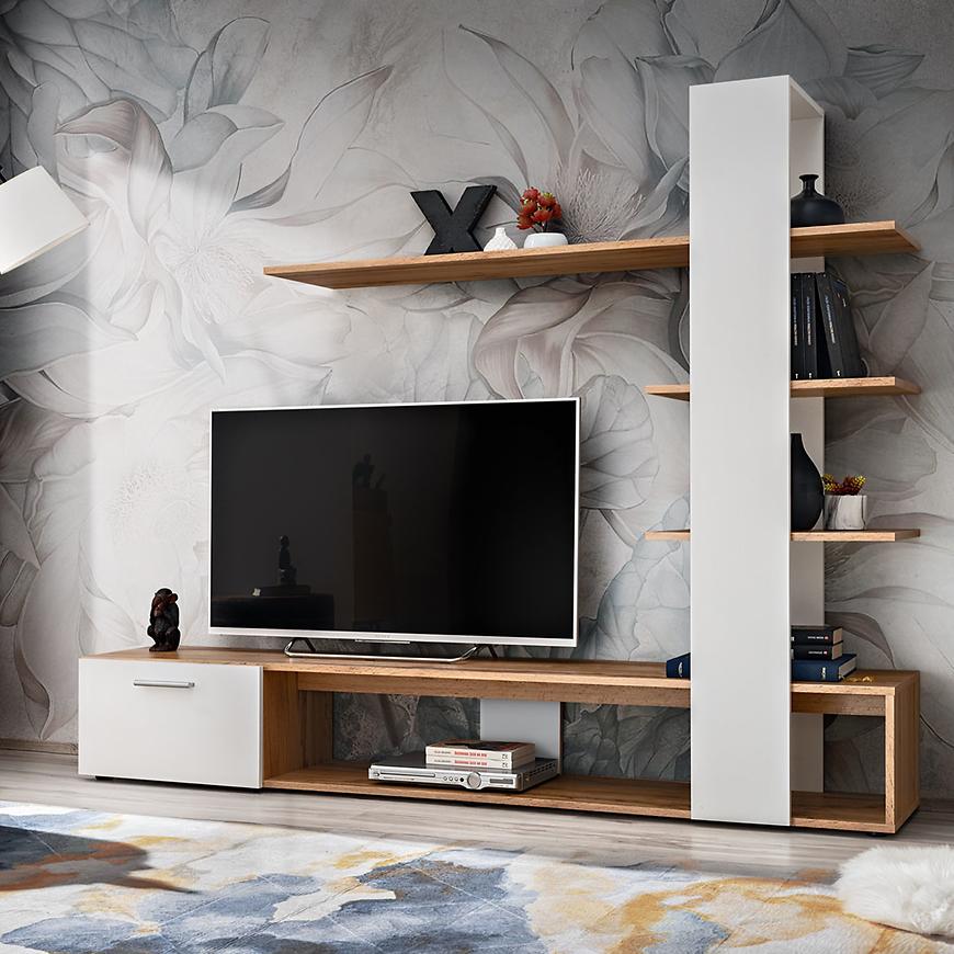 Meblościanka Eco to elegancki i nowoczesny mebel, który doda stylu i funkcjonalności do Twojego wnętrza. Jej kontrastowe kolory i solidna konstrukcja sprawiają, że stanowi doskonałe rozwiązanie do przechowywania i eksponowania różnych przedmiotów.