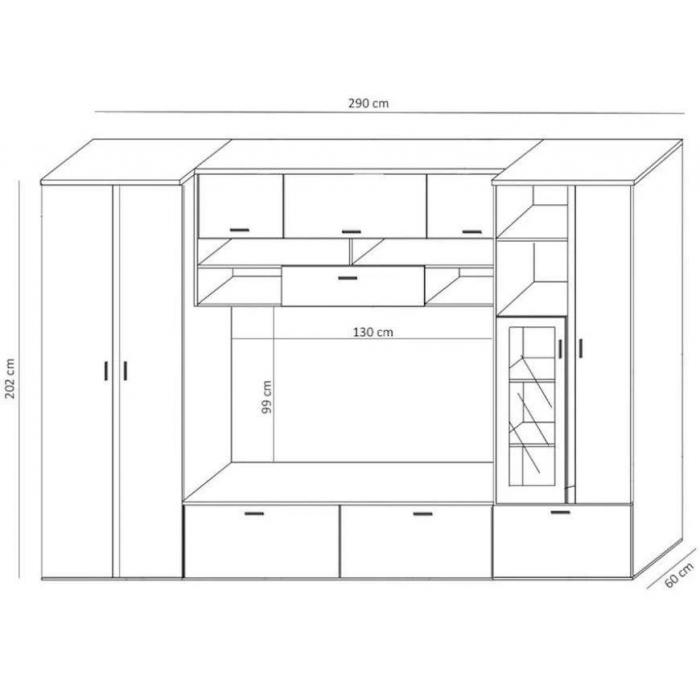 Zestaw o szerokości 290 cm, wysokości 202 cm i głębokości 60 cm zapewnia komfortową ilość miejsca na przechowywanie ubrań, dokumentów czy dodatków dekoracyjnych. Liczne półki, szafki i przestrzeń zamknięta umożliwiają zachowanie porządku w pomieszczeniu, a jednocześnie eksponowanie ulubionych przedmiotów. Meblościanka Enter to idealne rozwiązanie dla osób, które szukają mebli o dużej funkcjonalności i eleganckim wyglądzie.