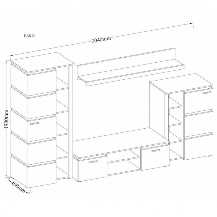 Meblościanka z kolekcji FARO to zestaw praktycznych mebli, dzięki którym stworzysz funkcjonalne, nowoczesne wnętrze. System meblowy doskonale sprawdzi się nawet w niewielkim salonie lub pokoju dziennym. Meble wchodzące w skład kompletu dostępne są w kolorystyce dąb artisan, która nada pomieszczeniu przytulnego charakteru. Sprawdź pozostałe meble, które dostępne są w bogatej kolekcji FARO. W skład ścianki Faro wchodzą, dwie szafki stojące, szafka pod telewizor oraz półka wisząca.