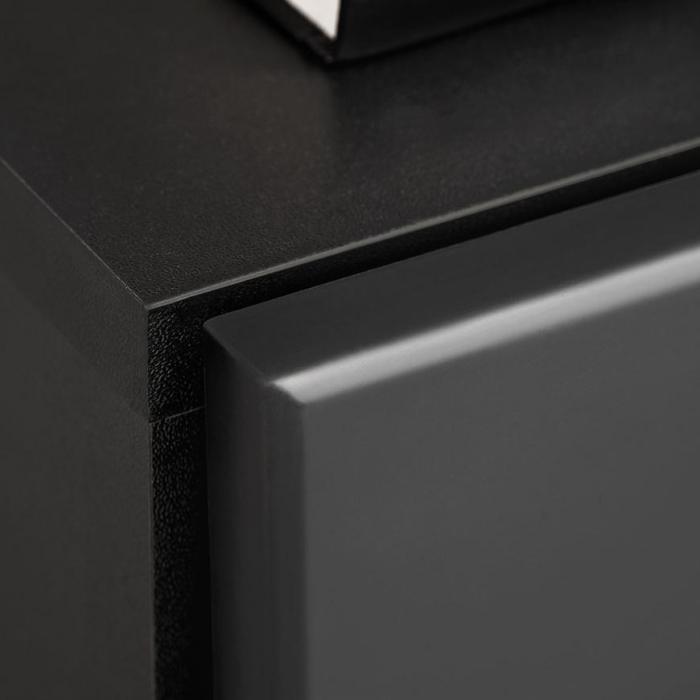 Meble Flame to efektowny rezultat zastosowania wysokiej jakości płyty wiórowej laminowanej, co zapewnia niezwykłą trwałość i wytrzymałość. Dekor w intensywnym odcieniu czerni, z elementami w kolorze perła grey, tworzy kontrastową i zachwycającą kompozycję. Matowe wykończenie frontów i korpusów podkreśla nowoczesny charakter, zapewniając jednocześnie spójny, niezwykle nowatorski wygląd.
