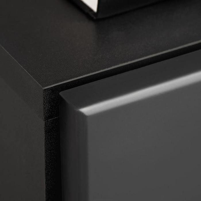 Meble Flame to efektowny rezultat zastosowania wysokiej jakości płyty wiórowej laminowanej, co zapewnia niezwykłą trwałość i wytrzymałość. Dekor w intensywnym odcieniu czerni, z elementami w kolorze perła grey, tworzy kontrastową i zachwycającą kompozycję. Matowe wykończenie frontów i korpusów podkreśla nowoczesny charakter, zapewniając jednocześnie spójny, niezwykle nowatorski wygląd.