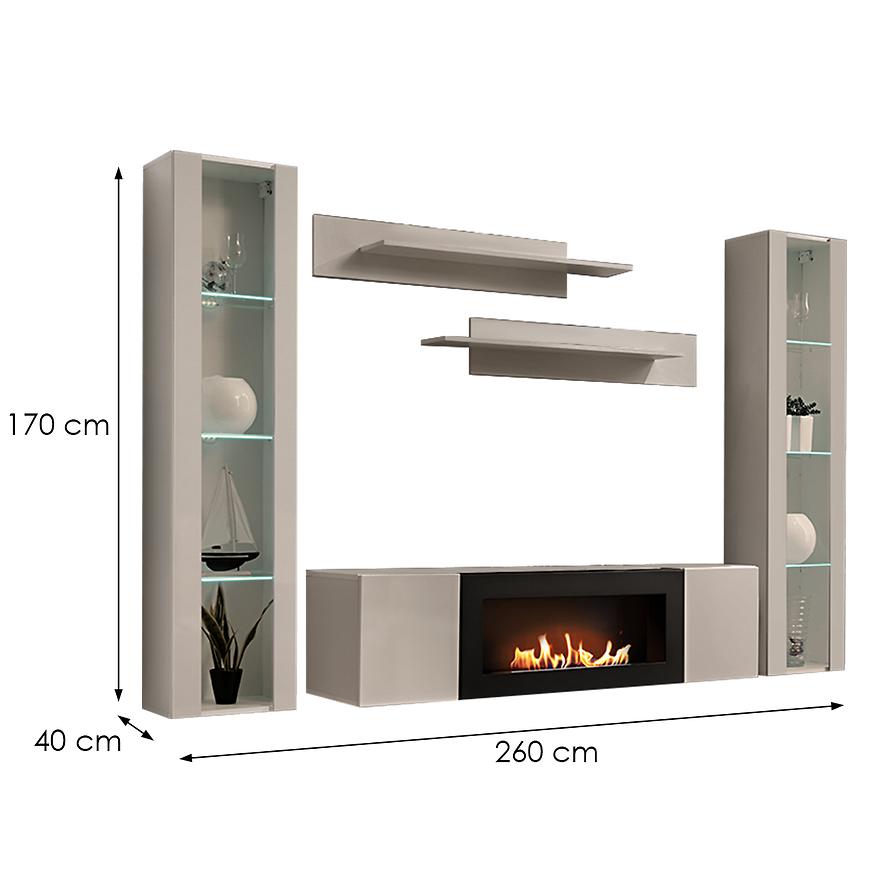 Wysoka na 170 cm i szeroka na 260 cm meblościanka oferuje dużo przestrzeni użytkowej, pozostając przy tym wizualnie smukła i nieprzytłaczająca. Wbudowany biokominek stanowi oryginalny akcent dekoracyjny, wprowadzając przytulną atmosferę do wnętrza.