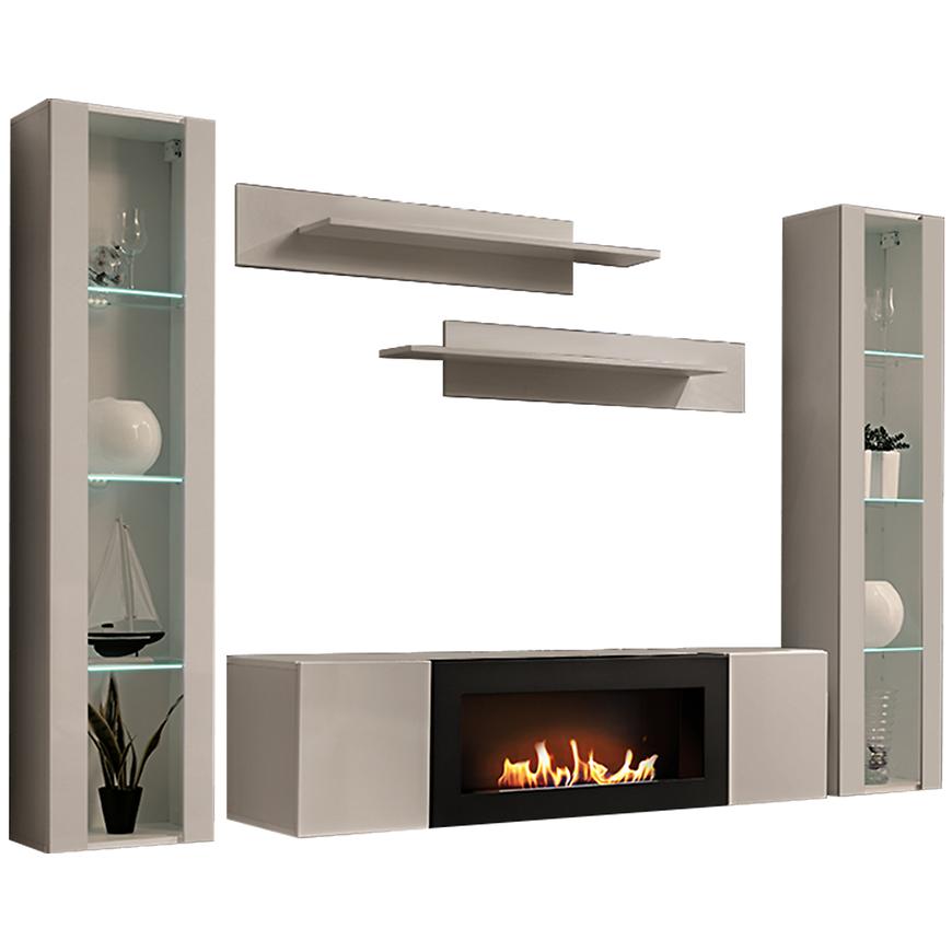 Meblościanka Fly Cc Fy M2 Kaszmir/Biokominek to stylowe i funkcjonalne rozwiązanie do nowoczesnego salonu. Jej jasne, beżowe wybarwienie w połączeniu z czarnymi akcentami oraz matowe wykończenie frontów i korpusu nadają aranżacji elegancji i lekkości.