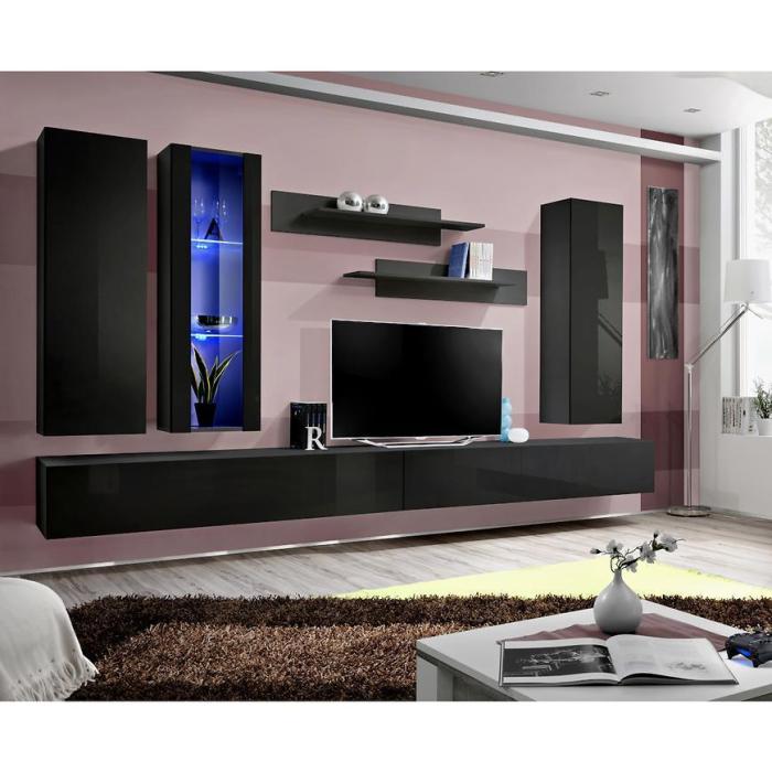 Meblościanka Fly E+szkło czarny Zz Fy E4 to szeroki zestaw mebli do salonu, który łączy elegancki design z praktycznym układem półek i szafek. Fronty w kolorze czarnym z połyskiem nadają meblowi wyrazisty i elegancki charakter, a matowy korpus tworzy subtelny kontrast, wprowadzając nowoczesny styl do wnętrza.