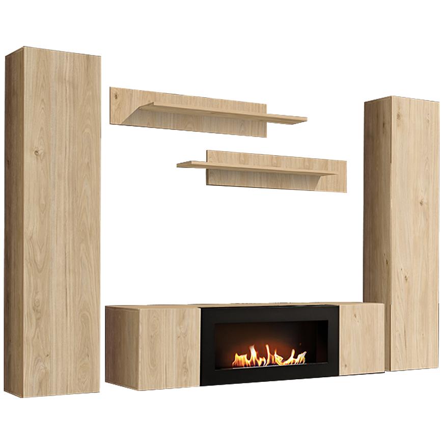 Meblościanka ma wymiary 170 cm wysokości, 260 cm szerokości i 40 cm głębokości, dzięki czemu oferuje dużo miejsca do przechowywania oraz ekspozycji dekoracji, książek czy sprzętu multimedialnego. Jednym z jej wyjątkowych elementów jest wbudowany biokominek, który nie tylko pełni funkcję dekoracyjną, ale również wprowadza do wnętrza przyjemną, nastrojową atmosferę, idealną na chłodniejsze wieczory.
