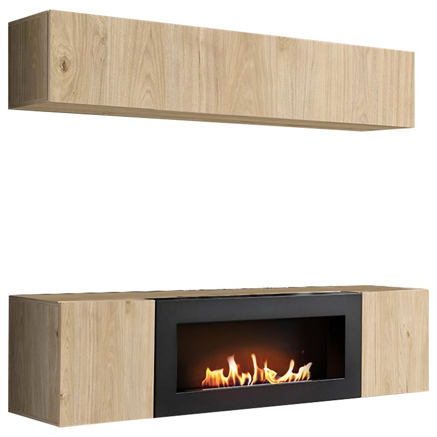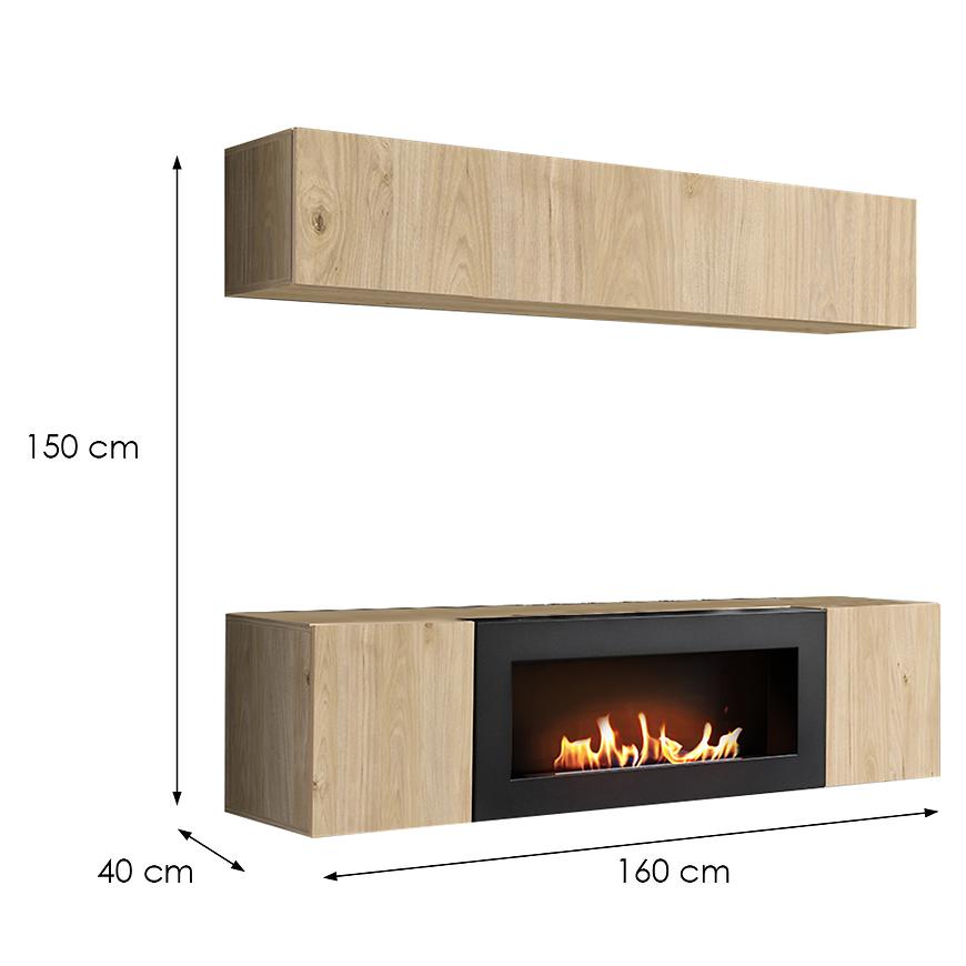 Meblościanka Fly Hj Fy N1 Hickory Jackson/Biokominek to nowoczesny i stylowy mebel wiszący, idealny do salonu. Wykonana z laminowanej płyty wiórowej w modnym połączeniu jasnego drewna Hickory Jackson i czarnych frontów w matowym wykończeniu. Ma kompaktowe wymiary: 150 cm wysokości, 160 cm szerokości i 40 cm głębokości, dzięki czemu doskonale sprawdzi się w przestrzeni salonowej, nie zajmując dużo miejsca.