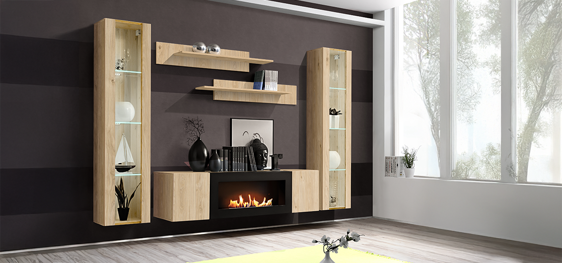 Meblościanka posiada wbudowany biokominek, który tworzy przytulną atmosferę w salonie, nadając wnętrzu ciepły i elegancki charakter. Nie posiada oświetlenia LED, ale jej nowoczesny design i jasne wybarwienie będą pięknie komponować się z różnymi stylami aranżacji salonu.