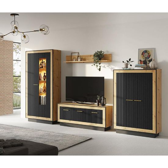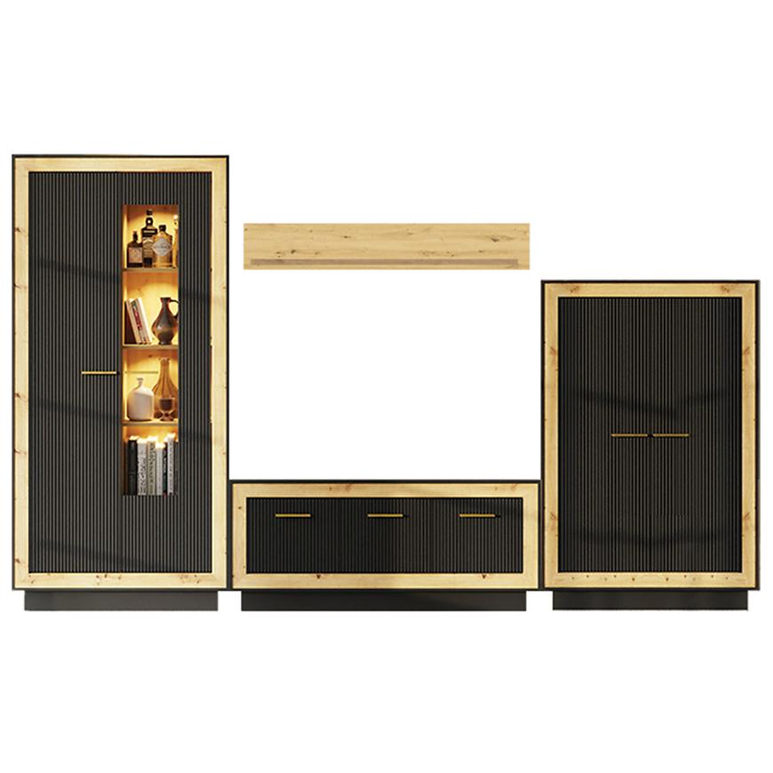 Czarny kolor frontów nadaje meblościance elegancji i charakteru, podkreślając jej nowoczesny styl. Natomiast jasne drewnopodobne wybarwienie korpusu dodaje ciepła i przytulności, tworząc harmonijną całość.