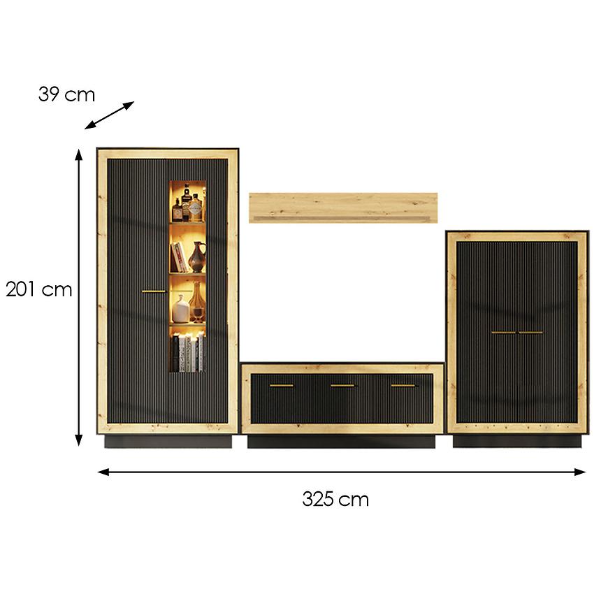 Meblościanka składa się z różnorodnych elementów, zapewniając dużo miejsca do przechowywania i eksponowania przedmiotów. Jej wymiary to 201 cm wysokości, 325 cm szerokości i 39 cm głębokości, dzięki czemu idealnie dopasuje się do większych salonów, tworząc efektowną kompozycję.