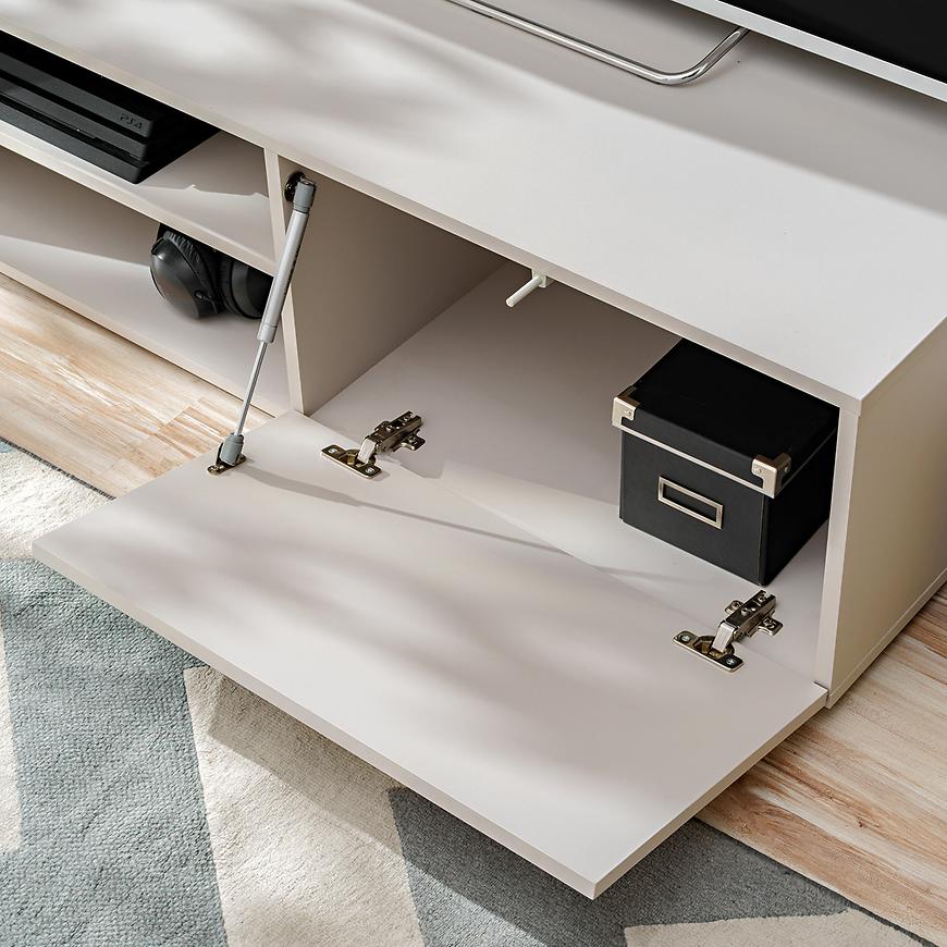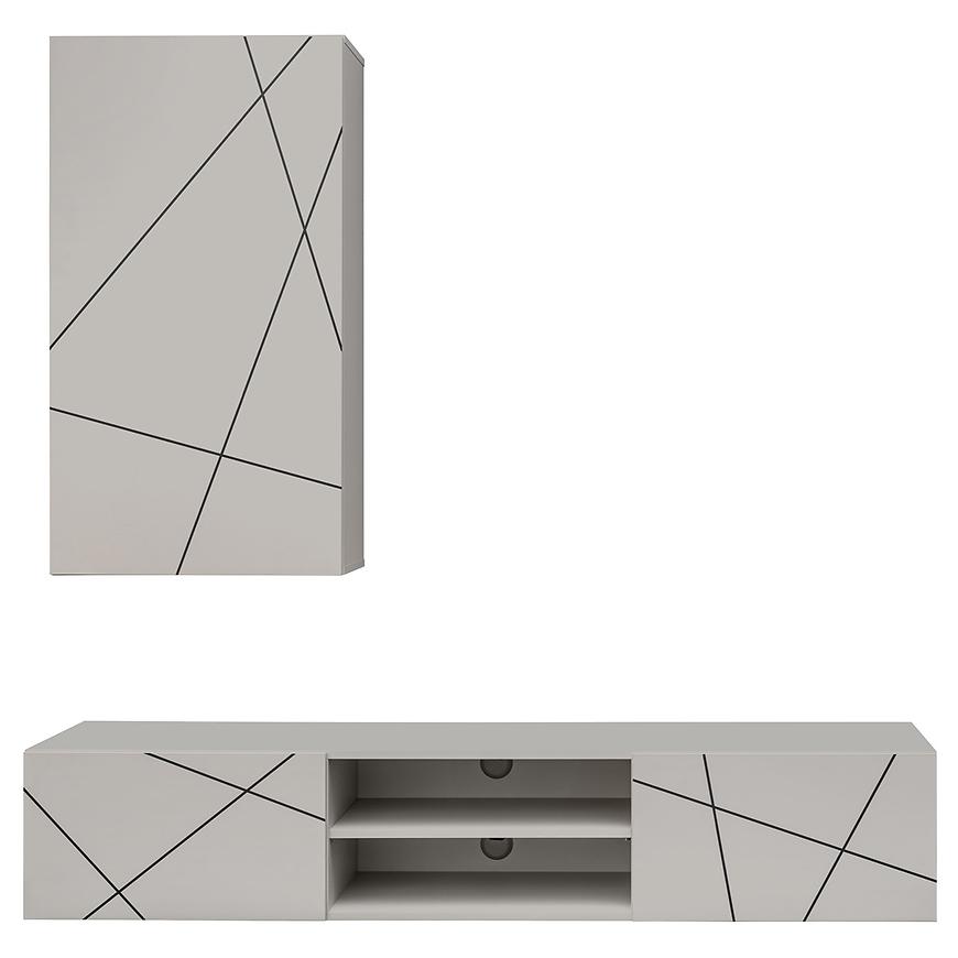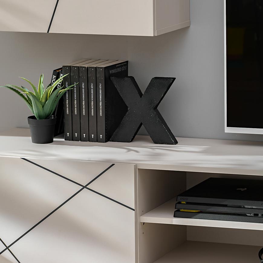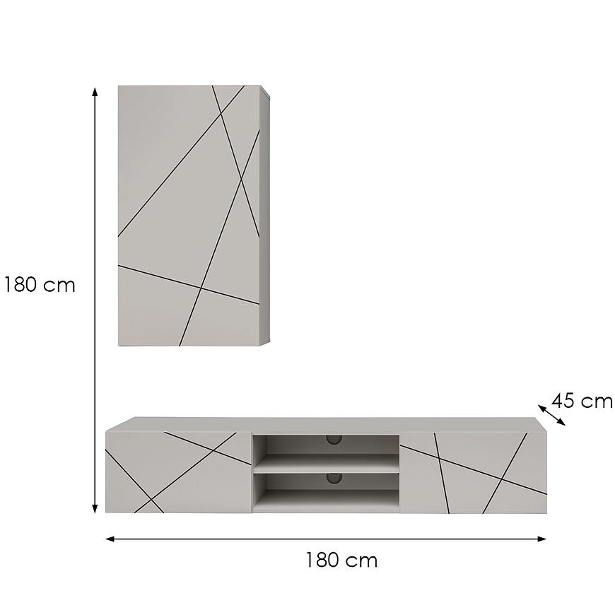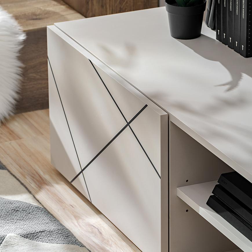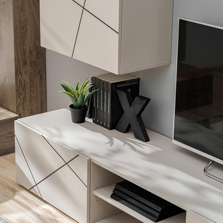 Meblościanka Geo I CC w kolorze kaszmir to nowoczesna propozycja do stylowego salonu. Jej kompaktowa forma (180 × 180 cm) sprawdzi się nawet w mniejszych przestrzeniach, oferując funkcjonalne miejsce do przechowywania i eksponowania dekoracji. Matowe wykończenie frontów i korpusu w modnym, beżowym odcieniu tworzy elegancki, spójny wygląd. Wykonana z wytrzymałej laminowanej płyty wiórowej, meblościanka Geo I łączy trwałość z ponadczasowym stylem, który doskonale uzupełni nowoczesny pokój dzienny.