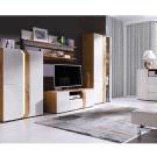 Meblościanka LOFT jest nowoczesnym i funkcjonalnym meblem. W jej skład wchodzi: duża pojemna komoda, funkcjonalna szafka rtv, przeszklona witryna oraz dwie praktyczne półki. Zestawienie kolorystyki lancelot na korpusie mebla wraz ze wstawkami w kolorze lancelot powoduje, że mebel jest niepowtarzalny i wprowadza doskonały charakter we wnętrzu. Biel na frontach w wysokim połysku oraz wstawki z barwie lancelot dodają meblościance niecodziennego wyglądu. Warto zwróciuć uwagę na efekt poświaty LED wzdłuż wstawek na frontach.