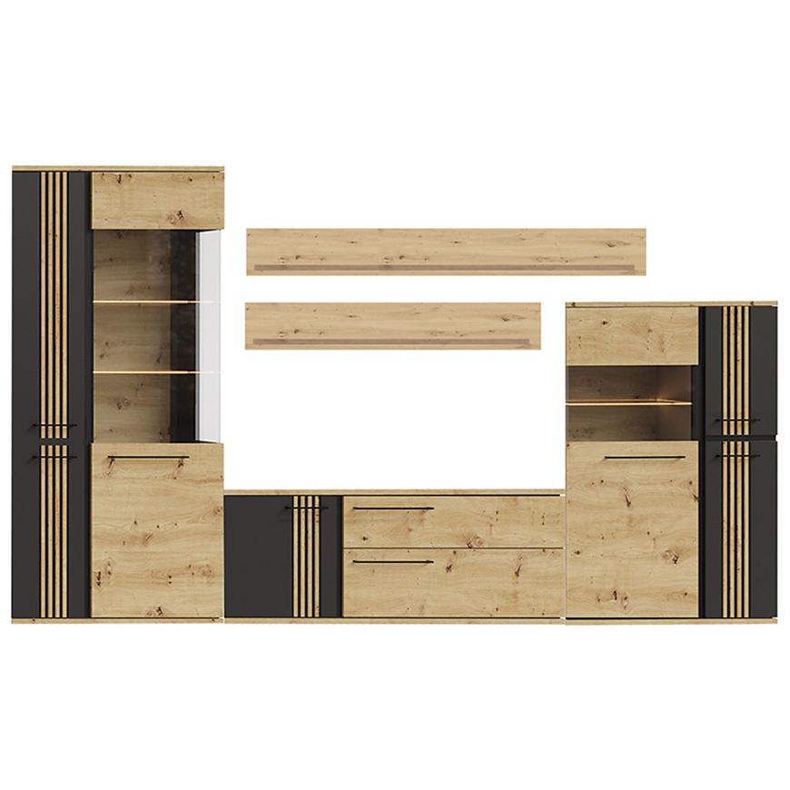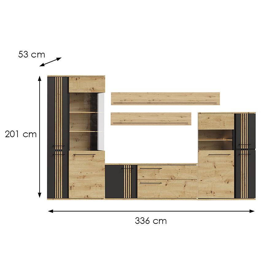 Wymiary meblościanki są imponujące: 201 cm wysokości, 336 cm szerokości i 53 cm głębokości. Ta przestronna konstrukcja zapewni Ci dużą przestrzeń do przechowywania oraz wystawiania różnorodnych przedmiotów, książek czy dekoracji. Kolor frontów to harmonijne połączenie czarnego z dębem artisan, które nadaje meblościance elegancji i kontrastu. Matowe wykończenie frontów dodaje designerskiego charakteru i nowoczesności. Cała konstrukcja frontów oparta jest na wysokiej jakości płycie MDF, co gwarantuje trwałość i solidność. Natomiast korpus meblościanki wykonany jest z płyty wiórowej laminowanej, co zapewnia stabilność i wytrzymałość. Meblościanka Molto black została wyposażona w oświetlenie, które stanowi idealne podświetlenie wystawianych przedmiotów, nadając całości jeszcze bardziej designerski charakter. Oświetlenie jest w standardzie, co sprawia, że zestaw od razu prezentuje się efektownie.
