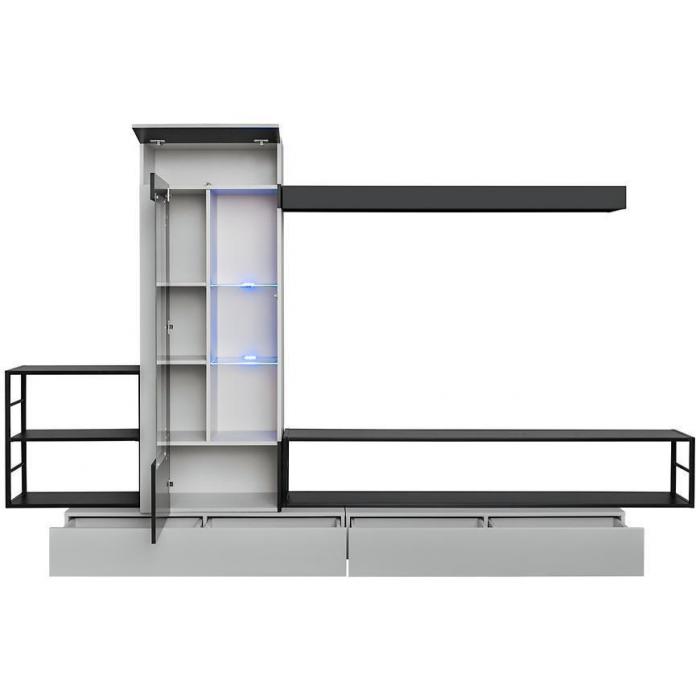 Meblościanka Rebel to nowoczesny zestaw mebli salonowych. Lekka, wbrew pozorom pojemna i funkcjonalna kompozycja idealnie wpasuje się w wystrój pomieszczenia w każdym stylu. Meblościanka to propozycja dla właścicieli dużych, przestronnych salonów, ale także mniejszych pomieszczeń.