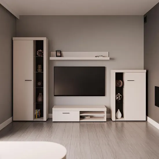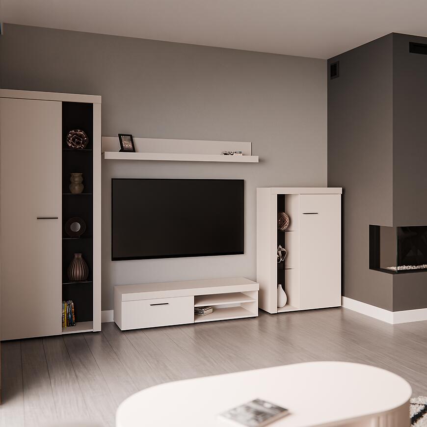 Meblościanka Rumba BP01 beż piaskowy oferuje połączenie estetyki i funkcjonalności. Przestrzeń do przechowywania, półki ekspozycyjne i możliwość doposażenia w oświetlenie LED sprawiają, że meblościanka staje się centralnym punktem salonu, podkreślając nowoczesny charakter wnętrza.