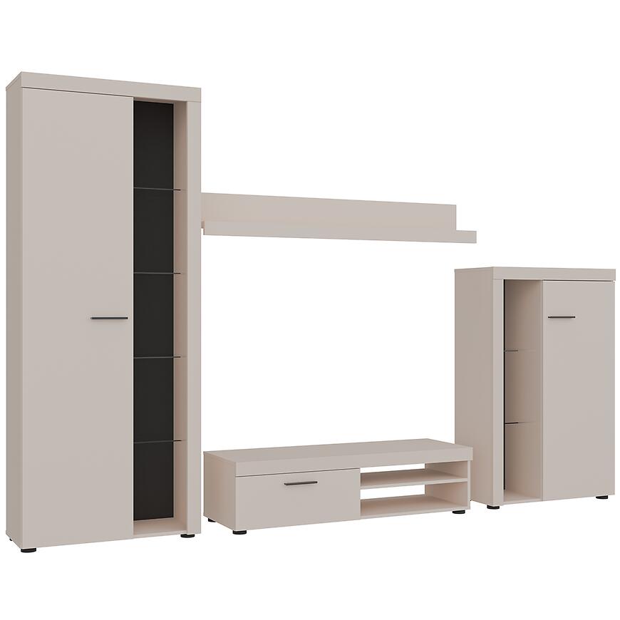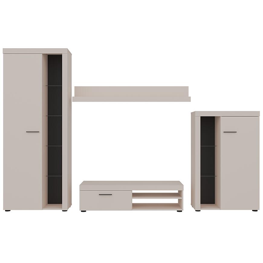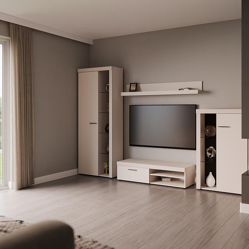 Meblościanka Rumba BP01 w kolorze beż piaskowy to elegancki i funkcjonalny zestaw mebli, który wprowadza nowoczesny styl do każdego salonu lub pokoju dziennego. Prosta forma i matowe wykończenie frontów nadają meblościance lekkości i subtelnej elegancji, a jasny odcień beżu wprowadza przytulny, ciepły akcent do wnętrza.