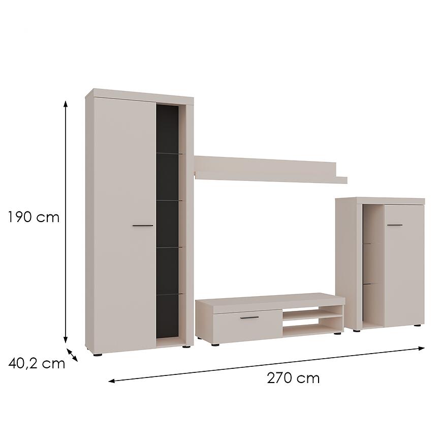 Zestaw o szerokości 270 cm, wysokości 190 cm i głębokości 40,2 cm oferuje przestrzeń do przechowywania i ekspozycji dekoracji, książek czy sprzętu RTV. Wbudowane oświetlenie LED (dostępne za dopłatą) pozwala dodatkowo podkreślić walory aranżacyjne i nadać wnętrzu przyjemną atmosferę.