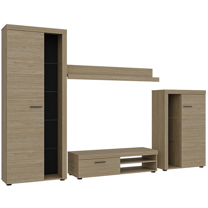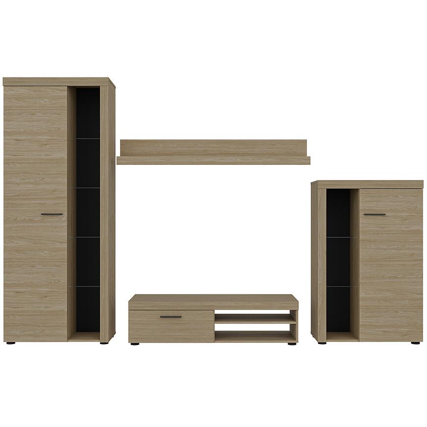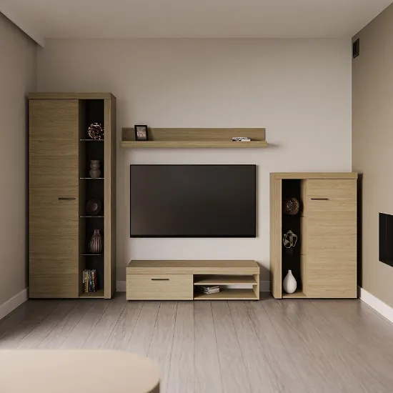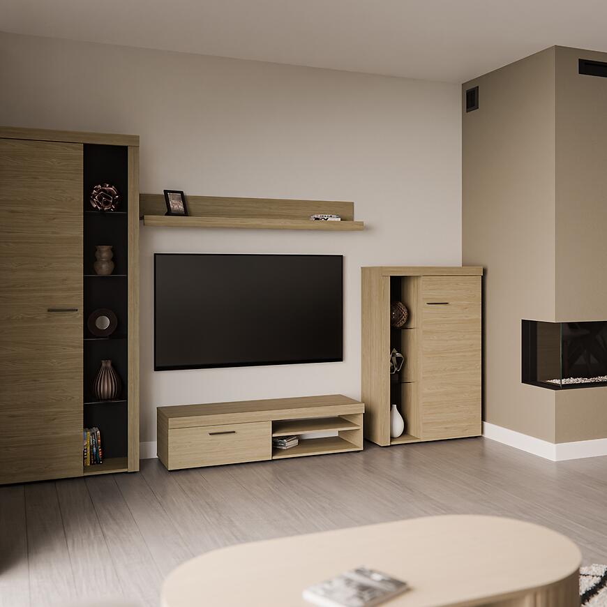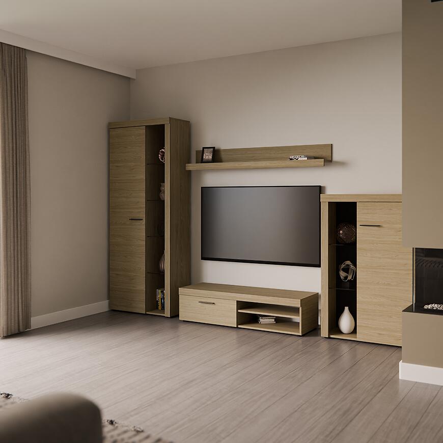 Meblościanka Rumba DO01 w kolorze dąb olejowany łączy funkcjonalność z eleganckim, nowoczesnym stylem. Prosta forma i matowe wykończenie frontów nadają meblościance lekkości i subtelnej elegancji, a jasny, drewnopodobny odcień wprowadza przytulny, naturalny akcent do salonu lub pokoju dziennego.