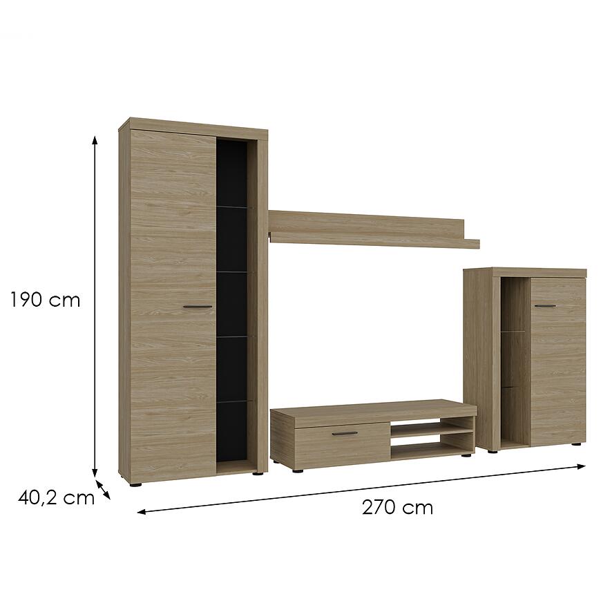 Zestaw o szerokości 270 cm, wysokości 190 cm i głębokości 40,2 cm oferuje przestrzeń do przechowywania książek, dekoracji, sprzętu RTV i codziennych akcesoriów. Możliwość doposażenia w oświetlenie LED (za dopłatą) podkreśla walory aranżacyjne i tworzy przyjemną atmosferę w pomieszczeniu.