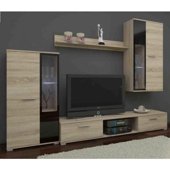 Fronty i korpus meblościanki są w jasnym wybarwieniu dąb sonoma z matowym wykończeniem, co nadaje całości lekkości i harmonijnego wyglądu. Dzięki subtelnej kolorystyce mebel pasuje do różnych aranżacji wnętrz – od minimalistycznych po nowoczesne salony i pokoje dzienne. Prosta linia meblościanki podkreśla nowoczesny styl i umożliwia łatwe dopasowanie do innych elementów wyposażenia.