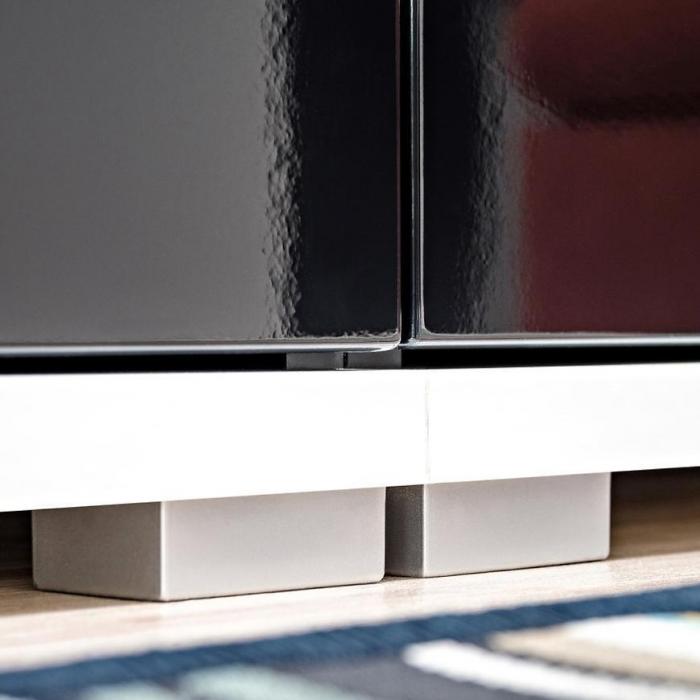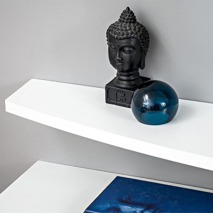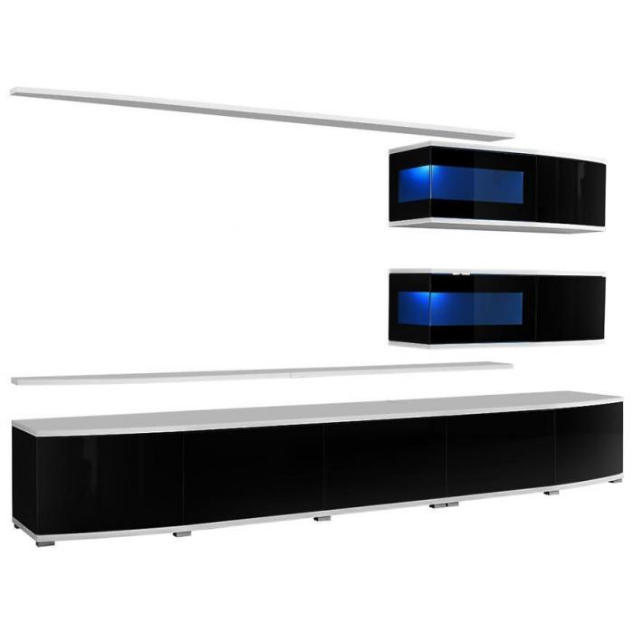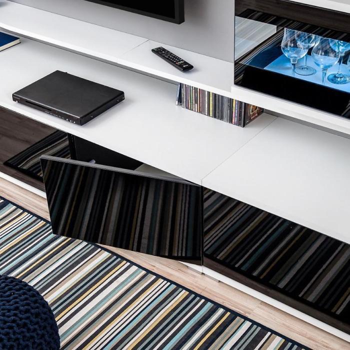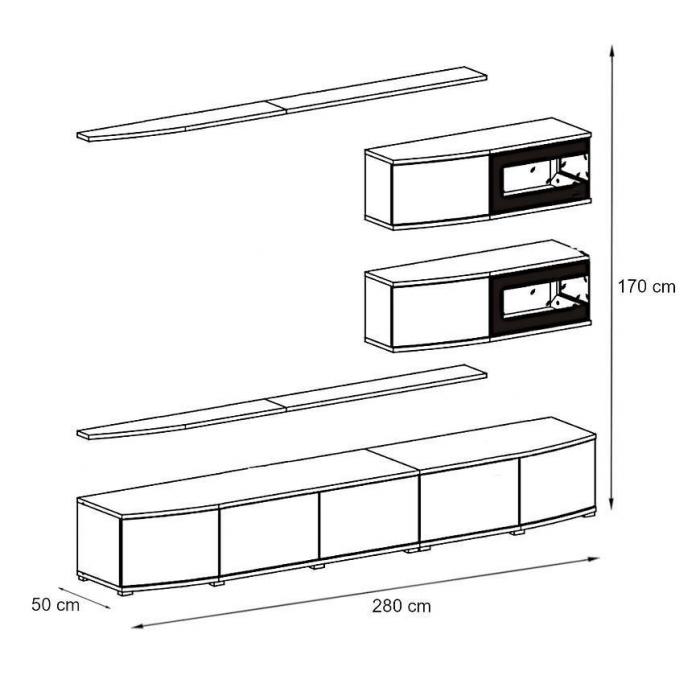 Kompozycja składa się z czterech wiszących półek ściennych oraz niskiej szafki pod telwizor.